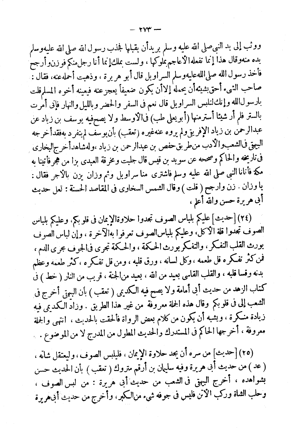 (25) [حَدِيثٌ] مَنْ سَرَّهُ أَنْ يَجِدَ حَلاوَةَ الإِيمَانِ، فَلْيَلْبَسِ الصُّوفَ، وَلْيَعْتَقِلْ شَاتَهُ، (عد) مِنْ حَدِيثِ أَبِي هُرَيْرَةَ وَفِيهِ سُلَيْمَان بن أَرقم مَتْرُوك (تعقب) بِأَن الحَدِيث حسن بشواهده، أخرج الْبَيْهَقِيّ فِي الشّعب من حَدِيث أبي هُرَيْرَة: من لبس الصُّوف، وحلب الشَّاة وَركب الأتن فَلَيْسَ فِي جَوْفه شَيْء من الْكبر، وَأخرج من حَدِيث أبي هُرَيْرَة