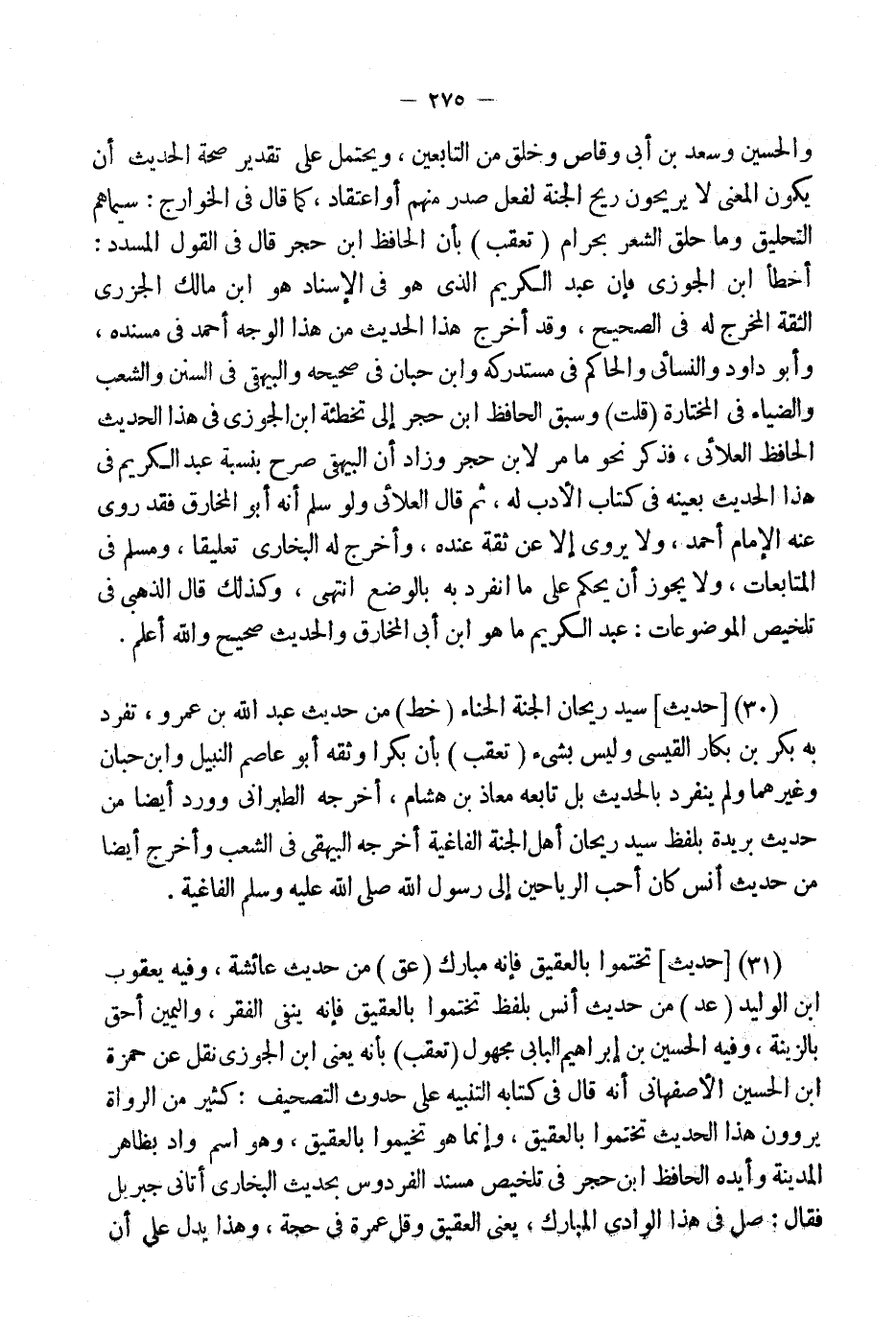 (30) [حَدِيثٌ] سَيِّدُ رَيْحَانِ الْجَنَّةِ الْحِنَّاءُ (خطّ) من حَدِيثِ عَبْدِ اللَّهِ بْنِ عَمْرٍو، تفرد بِهِ بكر بن بكار الْقَيْسِي وَلَيْسَ بِشَيْء (تعقب) بِأَن بكرا وَثَّقَهُ أَبُو عَاصِم النَّبِيل وَابْن حبَان وَغَيرهمَا وَلم ينْفَرد بِالْحَدِيثِ بل تَابعه معَاذ بن هِشَام، أخرجه الطَّبَرَانِيّ وَورد أَيْضا من حَدِيث بُرَيْدَة بِلَفْظ سيد ريحَان أهل الْجنَّة الفاغية أخرجه الْبَيْهَقِيّ فِي الشّعب وَأخرج أَيْضا من حَدِيث أنس كَانَ أحب الرياحين إِلَى رَسُول الله الفاغية.