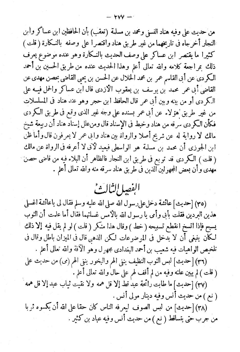 (35) [حَدِيثُ] عَائِشَةَ دَخَلَ عَلَيَّ رَسُولُ الله فَقَالَ لِي يَا عَائِشَةُ اغْسِلِي هَذَيْنِ الْبُرْدَيْنِ فَقُلْتُ بِأَبِي وَأُمِّي يَا رَسُولَ اللَّهِ بِالأَمْسِ غَسَلْتُهُمَا فَقَالَ أَمَا عَلِمْتِ أَنَّ الثَّوْبَ يُسَبِّحُ فَإِذَا اتَّسَخَ انْقَطَعَ تَسْبِيحُهُ (خطّ) وَقَالَ هَذَا مُنكر (قلت) لَو لم يقل فِيهِ إِلَّا ذَلِك لَكَانَ يَنْبَغِي أَن لَا يدْخل فِي الموضوعات لَكِن الذَّهَبِيّ قَالَ فِي الْمِيزَان بَاطِل وَقَالَ فِي تَلْخِيص الواهيات فِيهِ شُعَيْب بن أَحْمد الْبَغْدَادِيّ مَجْهُول وَهُوَ الآفة وَالله تَعَالَى أعلم.