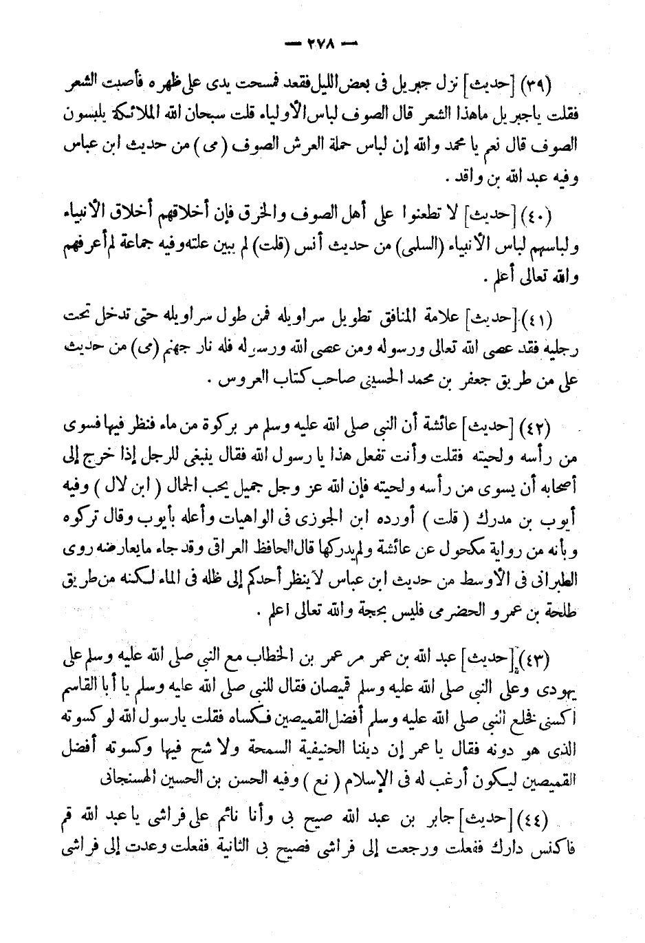 (39) [حَدِيثٌ] نَزَلَ جِبْرِيلُ فِي بَعْضِ اللَّيْلِ فَقَعَدَ فَمَسَحْتُ يَدِي عَلَى ظَهْرِهِ فَأَصَبْتُ الشَّعْرَ فَقُلْتُ يَا جِبْرِيلُ مَا هَذَا الشَّعْرُ قَالَ الصُّوفُ لِبَاسُ الأَوْلِيَاءِ قُلْتُ سُبْحَانَ اللَّهِ الْمَلائِكَةُ يَلْبَسُونَ الصُّوفَ قَالَ نَعَمْ يَا مُحَمَّدُ وَاللَّهُ إِنَّ لِبَاسَ حَمَلَةِ الْعَرْشِ الصُّوفُ (مي) مِنْ حَدِيثِ ابْنِ عَبَّاسٍ وَفِيهِ عبد الله بن وَاقد.