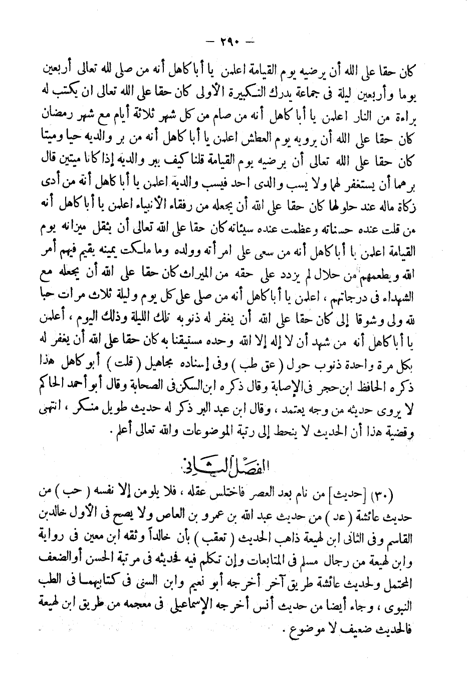 (30) [حَدِيثٌ] مَنْ نَامَ بَعْدَ الْعَصْرِ فَاخْتُلِسَ عَقْلُهُ، فَلا يَلُومَنَّ إِلا نَفْسَهُ (حب) من حَدِيث عَائِشَة (عد) من حَدِيث عبد الله بن عَمْرو بن الْعَاصِ وَلَا يَصح فِي الأول خَالِد بن الْقَاسِم وَفِي الثَّانِي ابْن لَهِيعَة ذَاهِب الحَدِيث (تعقب) بِأَن خَالِدا وَثَّقَهُ ابْن معِين فِي رِوَايَة وَابْن لَهِيعَة من رجال مُسلم فِي المتابعات وَإِن تلكم فِيهِ فَحَدِيثه فِي مربتة الْحسن أَو الضعْف الْمُحْتَمل وَلِحَدِيث عَائِشَة طَرِيق آخر أخرجه أَبُو نعيم وَابْن السّني فِي كِتَابَيْهِمَا فِي الطِّبّ النَّبَوِيّ، وَجَاء أَيْضا من حَدِيث أنس أخرجه الْإِسْمَاعِيلِيّ فِي مُعْجَمه من طَرِيق ابْن لَهِيعَة فَالْحَدِيث ضَعِيف لَا مَوْضُوع.