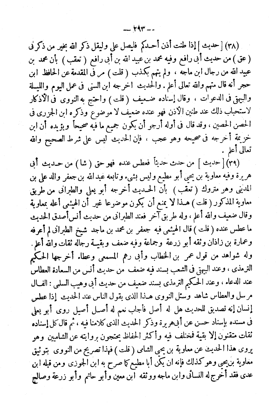 (38) [حَدِيثٌ] إِذَا طَنَّتْ أُذُنُ أَحَدِكُمْ فَلْيُصَلِّ عَلَيَّ وَلْيَقُلْ ذَكَرَ اللَّهُ بِخَيْرٍ مَنْ ذَكَرَنِي (عق) من حَدِيث أبي رَافع وَفِيه مُحَمَّد بن عبيد الله بن أبي رَافع (تعقب) بِأَن مُحَمَّد بن عبيد الله من رجال ابْن مَاجَه، وَلم يتهم بكذب (قلت) مر فِي الْمُقدمَة عَن الْحَافِظ ابْن حجر أَنه قَالَ مُتَّهم وَالله تَعَالَى أعلم.