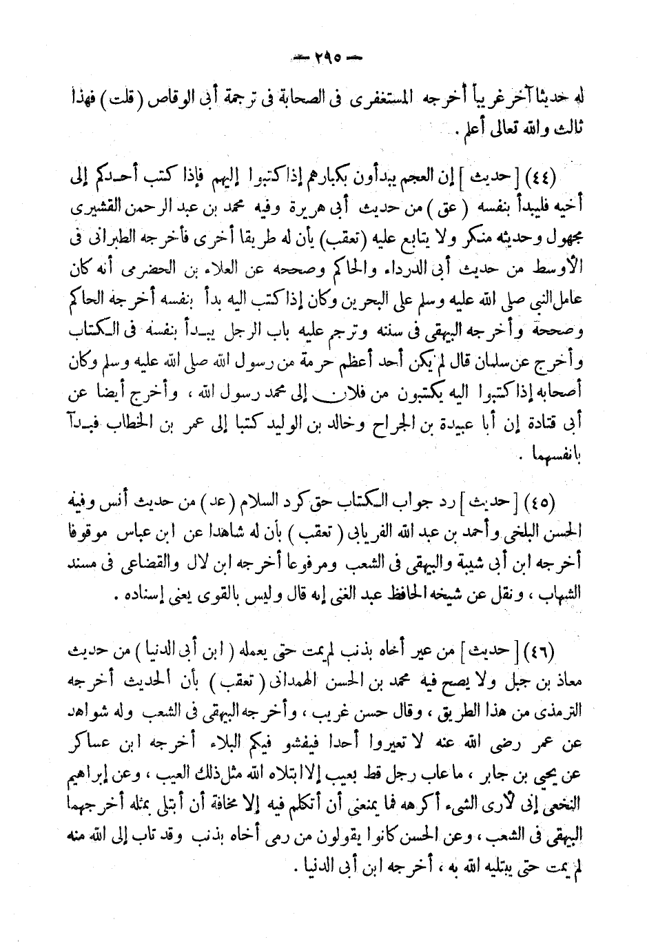 (45) [حَدِيثٌ] رَدُّ جَوَابِ الْكِتَابِ حَقٌّ كَرَدِّ السَّلامِ (عد) من حَدِيث أنس وَفِيه الْحسن الْبَلْخِي وَأحمد بن عبد الله الْفرْيَابِيّ (تعقب) بِأَن لَهُ شَاهدا عَنِ ابْنِ عَبَّاسٍ مَوْقُوفًا أَخْرَجَهُ ابْن أبي شيبَة وَالْبَيْهَقِيّ فِي الشّعب وَمَرْفُوعًا أخرجه ابْن لال والقضاعي فِي مُسْند الشهَاب، وَنقل عَن شَيْخه الْحَافِظ عبد الْغَنِيّ إِنَّه قَالَ وَلَيْسَ بِالْقَوِيّ يَعْنِي إِسْنَاده.