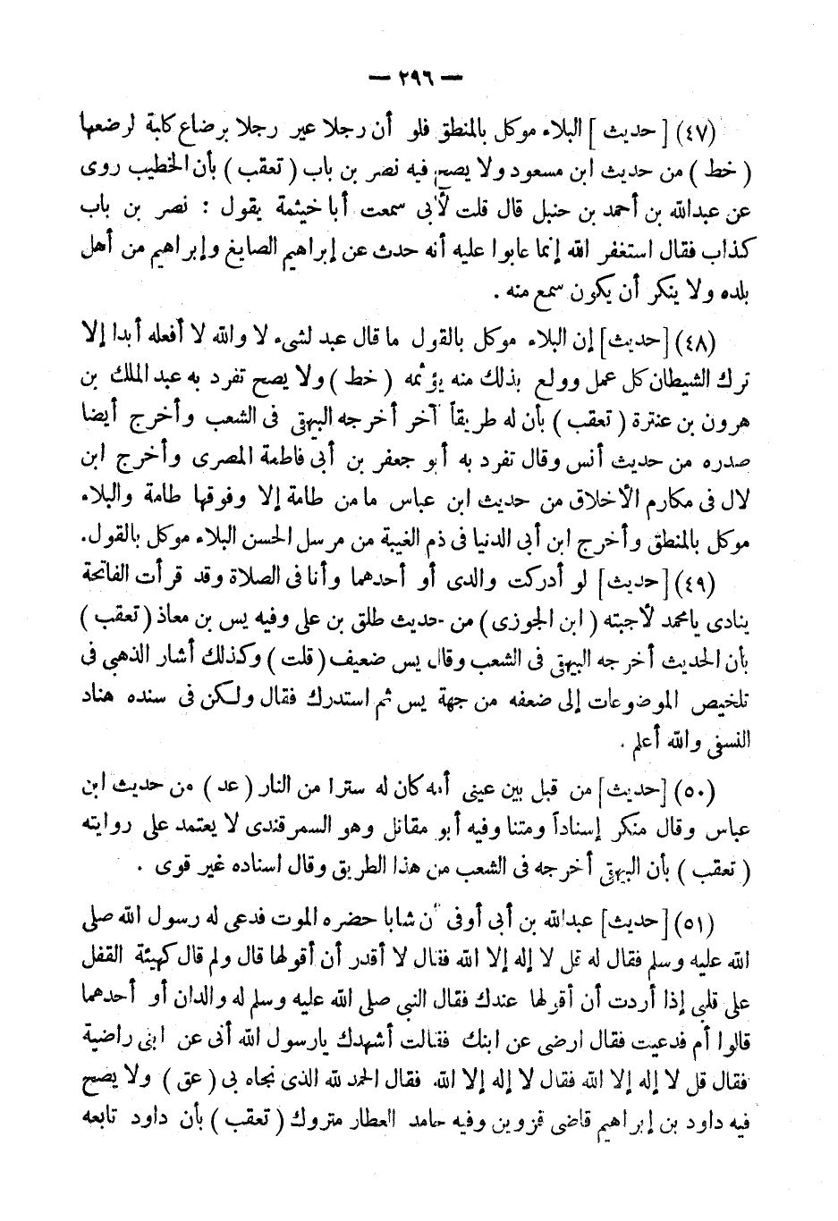 (49) [حَدِيثٌ] لَوْ أَدْرَكْتُ وَالِدَيَّ أَوْ أَحَدَهُمَا وَأَنَا فِي الصَّلاةِ وَقَدْ قَرَأْتُ الْفَاتِحَةَ يُنَادِي يَا مُحَمَّدُ لأَجَبْتُهُ (ابْن الْجَوْزِيّ) من حَدِيث طلق بن عَليّ وَفِيه يس بن معَاذ (تعقب) بِأَن الحَدِيث أخرجه الْبَيْهَقِيّ فِي الشّعب وَقَالَ يس ضَعِيف (قلت) وَكَذَلِكَ أَشَارَ الذَّهَبِيّ فِي تَلْخِيص الموضوعات إِلَى ضعفه من جِهَة يس ثمَّ استدرك فَقَالَ وَلَكِن فِي سَنَده هناد النَّسَفِيّ وَالله أعلم.