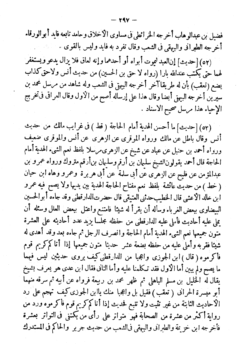 (53) [حَدِيثٌ] مَا أَحْسَنَ الْهَدِيَّةَ أَمَامَ الْحَاجَةِ (قطّ) فِي غرايب مَالك من حَدِيث أنس وَقَالَ بَاطِل عَن مَالك وَرَوَاهُ الموقري عَن الزُّهْرِيّ عَن أنس والموقري ضَعِيف وَرَوَاهُ أَحْمد بن حَنْبَل عَن عباد عَن شيخ عَن الزُّهْرِيّ مُرْسلا بِلَفْظ نعم الشَّيْء الْهَدِيَّة أَمَام الْحَاجة قَالَ أَحْمد يَقُولُونَ الشَّيْخ سُلَيْمَان بن أَرقم وَسليمَان بن أَرقم مَتْرُوك وَرَوَاهُ عَمْرو بن عبد الْمُؤمن عَن فليح عَن الزُّهْرِيّ عَن أبي سَلمَة عَن أبي هُرَيْرَة وَعَمْرو وهاه ابْن حبَان (خطّ) من حَدِيث عَائِشَة بِلَفْظ نعم مِفْتَاح الْحَاجة الْهَدِيَّة بَين يَديهَا وَلَا يَصح فِيهِ عَمْرو ابْن خَالِد الْأَعْشَى قَالَ الْخَطِيب حَدثنِي العتيقي قَالَ حضرت الدَّارَقُطْنِيّ وَقد جَاءَهُ أَبُو الْحُسَيْن الْبَيْضَاوِيّ بِبَعْض الغرباء وَسَأَلَهُ أَن يقْرَأ لَهُ شَيْئا فَامْتنعَ واعتل بِبَعْض الْعِلَل وسئله أَن يملي عَلَيْهِ أَحَادِيث فأملى عَلَيْهِ الدَّارَقُطْنِيّ من حفظه مَجْلِسا يزِيد عدد أَحَادِيثه على الْعشْرَة متون جَمِيعهَا نعم الشَّيْء الْهَدِيَّة أَمَام الْحَاجة وَانْصَرف الرجل ثمَّ جَاءَهُ بعد وَقد أهْدى لَهُ شَيْئا فقربه وأملى عَلَيْهِ من حفظه بضعَة عشر حَدِيثا متون جَمِيعهَا إِذا أَتَاكُم كريم قوم فأكرموه (قَالَ) ابْن الْجَوْزِيّ وَاعجَبا من الدَّارَقُطْنِيّ كَيفَ يروي حديثين لَيْسَ فيهمَا مَا يَصح وَلم يبين أما الأول فقد تكلمنا عَلَيْهِ وَأما الثَّانِي فَقَالَ ابْن عدي هُوَ يعرف بشيخ يُقَال لَهُ الْخَلِيل بن مُسلم الْبَاهِلِيّ ثمَّ ظهر مُحَمَّد بن ربيعَة فَرَوَاهُ عَن أَبِيه ثمَّ سَرقه مِنْهُمَا أَبُو ميسرَة الْحَرَّانِي (تعقب) فَقيل بل وَاعجَبا مِنْك يَا ابْن الْجَوْزِيّ كَيفَ تهجم على رد الْأَحَادِيث الثَّابِتَة من غير تثبت وَلَا تتبع فَحَدِيث إِذا أَتَاكُم كريم قوم فأكرموه ورد من رِوَايَة أَكثر من عشرَة من الصَّحَابَة فَهُوَ متواتر على رَأْي من يَكْتَفِي فِي التَّوَاتُر بِعشْرَة فَأخْرجهُ ابْن خُزَيْمَة وَالطَّبَرَانِيّ وَالْبَيْهَقِيّ فِي الشّعب من حَدِيث جرير وَالْحَاكِم فِي الْمُسْتَدْرك