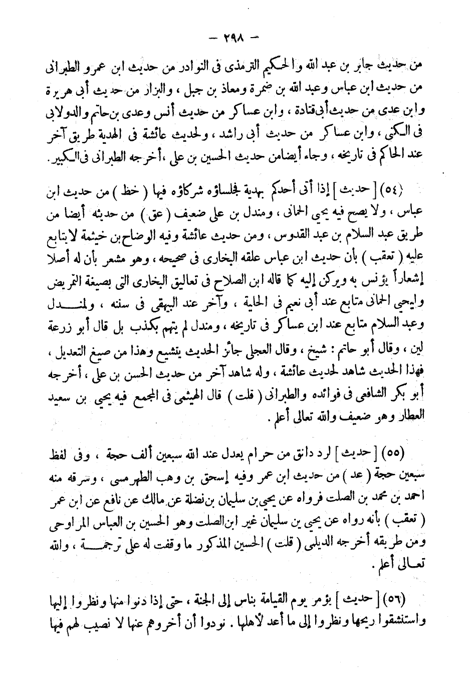 (55) [حَدِيثٌ] لَرَدُّ دَانِقٍ مِنْ حَرَامٍ يَعْدِلُ عِنْدَ اللَّهِ سَبْعِينَ أَلْفَ حَجَّةٍ، وَفِي لفظ سبعين حجَّة (عد) من حَدِيث ابْن عمر وَفِيه إِسْحَاق بن وهب الطهرمسي، وَسَرَقَهُ مِنْهُ أَحْمد بن مُحَمَّد بن الصَّلْت فَرَوَاهُ عَن يحيى بن سُلَيْمَان بن نَضْلَة عَن مَالك عَن نَافِع عَن ابْن عمر (تعقب) بِأَنَّهُ رَوَاهُ عَن يحيى بن سُلَيْمَان غير ابْن الصَّلْت وَهُوَ الْحُسَيْن بن الْعَبَّاس المراوحي وَمن طَرِيقه أخرجه الديلمي (قلت) الْحُسَيْن الْمَذْكُور مَا وقفت لَهُ على تَرْجَمَةٍ، وَاللَّهُ تَعَالَى أَعْلَمُ.