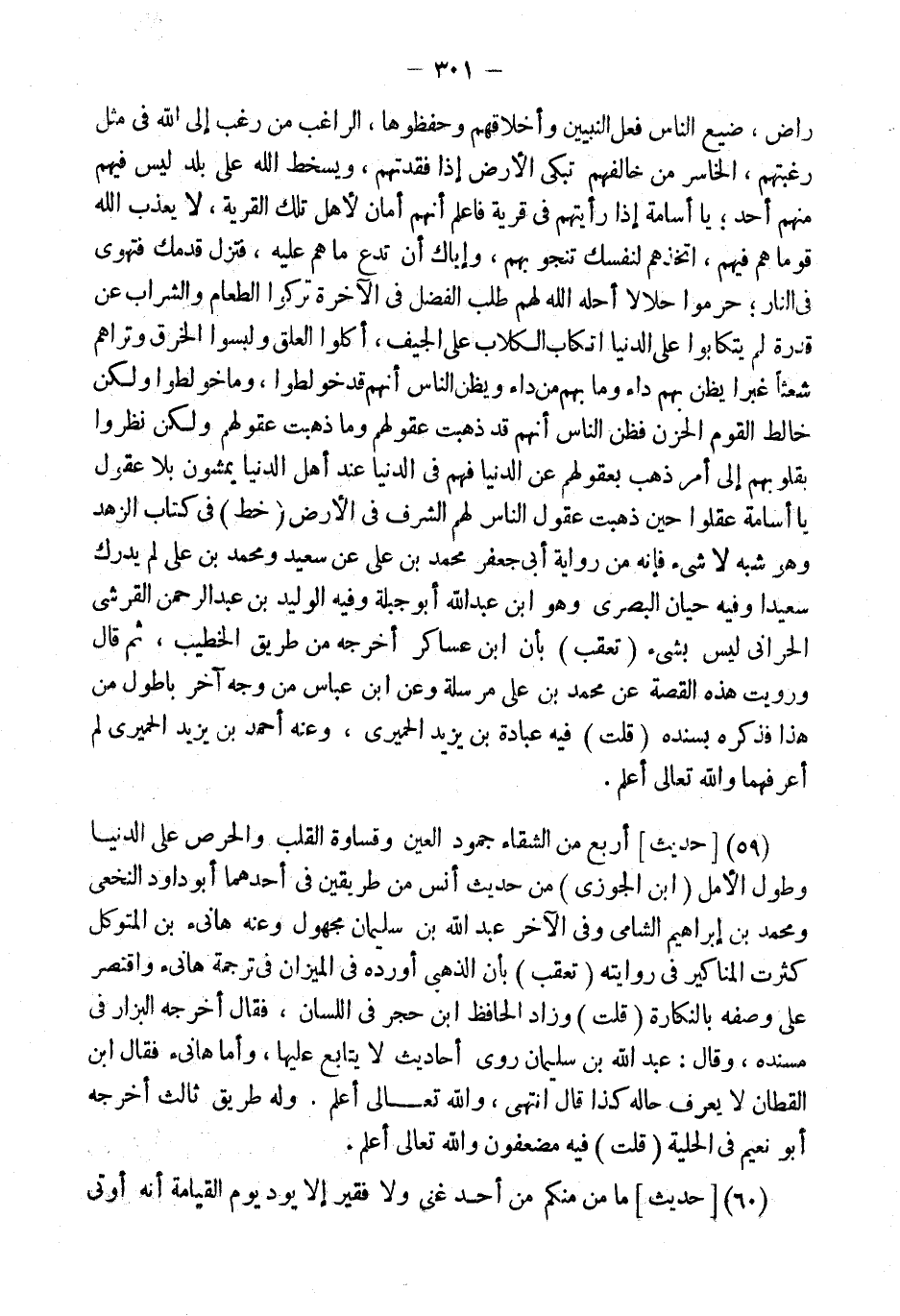 (59) [حَدِيثٌ] أَرْبَعٌ مِنَ الشَّقَاءِ جُمُودُ الْعَيْنِ وَقَسَاوَةُ الْقَلْبِ وَالْحِرْصُ عَلَى الدُّنْيَا وَطُولُ الأَمَلِ (ابْن الْجَوْزِيّ) من حَدِيث أنس من طَرِيقين فِي أَحدهمَا أَبُو دَاوُد النَّخعِيّ وَمُحَمّد بن إِبْرَاهِيم الشَّامي وَفِي الآخر عبد الله بن سُلَيْمَان مَجْهُول وَعنهُ هَانِئ بن المتَوَكل كثرت الْمَنَاكِير فِي رِوَايَته (تعقب) بِأَن الذَّهَبِيّ أوردهُ فِي الْمِيزَان فِي تَرْجَمَة هَانِئ وَاقْتصر على وَصفه بالنكارة (قلت) وَزَاد الْحَافِظ ابْن حجر فِي اللِّسَان، فَقَالَ أخرجه الْبَزَّار فِي مُسْنده، وَقَالَ: عبد الله بن سُلَيْمَان روى أَحَادِيث لَا يُتَابع عَلَيْهَا، وَأما هَانِئ فَقَالَ ابْنُ الْقَطَّانِ لَا يُعْرَفُ حَالُهُ كَذَا قَالَ انْتهى، وَالله تَعَالَى أعلم.