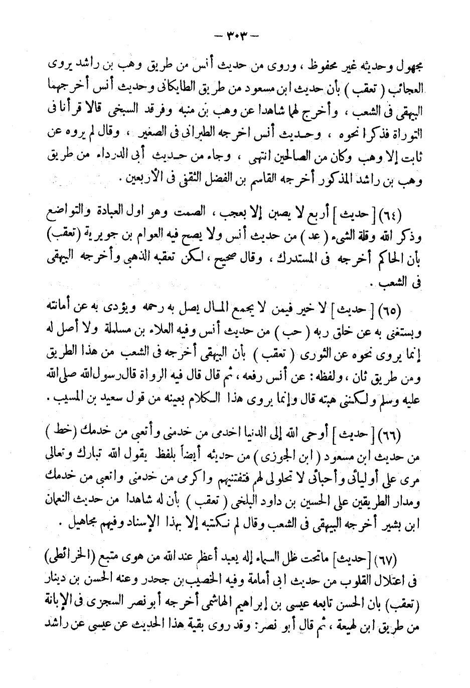 (65) [حَدِيثُ] لَا خَيْرَ فِيمَنْ لَا يَجْمَعُ الْمَالَ يَصِلُ بِهِ رَحِمَهُ وَيُؤَدِّي بِهِ عَنْ أَمَانَتِهِ وَيَسْتَغْنِي بِهِ عَنْ خَلْقِ رَبِّهِ (حب) من حَدِيث أنس وَفِيه الْعَلَاء بن مسلمة وَلَا أصل لَهُ إِنَّمَا يروي نَحوه عَن الثَّوْريّ (تعقب) بِأَن الْبَيْهَقِيّ أخرجه فِي الشّعب من هَذَا الطَّرِيق وَمن طَرِيق ثَان، وَلَفظه: عَن أنس رَفعه، ثمَّ قَالَ قَالَ فِيهِ الروَاة قَالَ رَسُول الله ولكنني هِبته قَالَ وَإِنَّمَا يروي هَذَا الْكَلَام بِعَيْنِه من قَول سعيد بن الْمسيب.