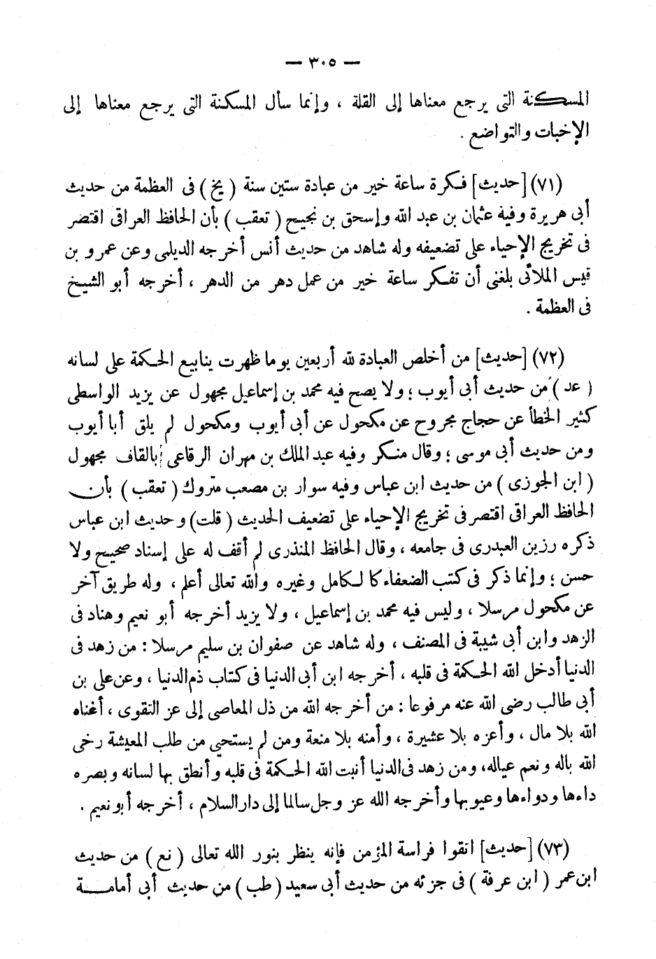 (72) [حَدِيثٌ] مَنْ أَخْلَصَ الْعِبَادَةَ لِلَّهِ أَرْبَعِينَ يَوْمًا ظَهَرَتْ يَنَابِيعُ الْحِكْمَةِ عَلَى لِسَانِهِ (عد) من حَدِيث أبي أَيُّوب؛ وَلَا يَصح فِيهِ مُحَمَّد بن إِسْمَاعِيل مَجْهُول عَن يزِيد الوَاسِطِيّ كثير الْخَطَأ عَن حجاج مَجْرُوح عَن مَكْحُول عَن أبي أَيُّوب وَمَكْحُول لم يلق أَبَا أَيُّوب وَمن حَدِيث أبي مُوسَى؛ وَقَالَ مُنكر وَفِيه عبد الْملك بن مهْرَان الرقاعي بِالْقَافِ مَجْهُول (ابْن الْجَوْزِيّ) من حَدِيث ابْن عَبَّاس وَفِيه سوار بن مُصعب مَتْرُوك (تعقب) بِأَن الْحَافِظ الْعِرَاقِيّ اقْتصر فِي تَخْرِيج الْأَحْيَاء على تَضْعِيف الحَدِيث (قلت) وَحَدِيث ابْن عَبَّاس ذكره رزين الْعَبدَرِي فِي جَامعه، وَقَالَ الْحَافِظ الْمُنْذِرِيّ لم أَقف لَهُ على إِسْنَاد صَحِيح وَلَا حسن؛ وَإِنَّمَا ذكر فِي كتب الضُّعَفَاء كالكامل وَغَيره وَالله تَعَالَى أعلم، وَله طَرِيق آخر عَن مَكْحُول مُرْسلا، وَلَيْسَ فِيهِ مُحَمَّد بن إِسْمَاعِيل، وَلَا يزِيد أخرجه أَبُو نعيم وهناد فِي الزّهْد وَابْن أبي شيبَة فِي المُصَنّف، وَله شَاهد عَن صَفْوَان بن سليم مُرْسلا: من زهد فِي الدُّنْيَا أَدخل الله الْحِكْمَة فِي قلبه، أخرجه ابْن أبي الدُّنْيَا فِي كتاب ذمّ الدُّنْيَا، وَعَن عَليّ بن أبي طَالب رَضِي الله عَنهُ مَرْفُوعا: من أخرجه الله من ذل الْمعاصِي إِلَى عز التَّقْوَى، أغناه الله بِلَا مَال، وأعزه بِلَا عشيرة، وأمنه بِلَا مَنْعَة وَمن لم يستحيي من طلب الْمَعيشَة رخى الله باله وَنعم عِيَاله، وَمن زهد فِي الدُّنْيَا أنبت الله الْحِكْمَة فِي قلبه وأنطق بهَا لِسَانه وبصره داءها ودواءها وعيوبها وَأخرجه الله عز وَجل سالما إِلَى دَار السَّلَام، أخرجه أَبُو نعيم.