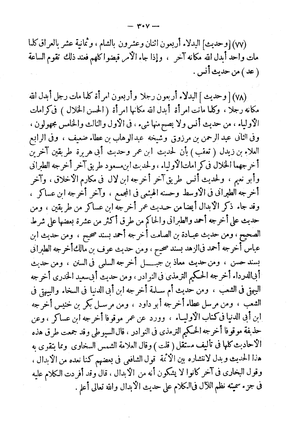 (78) [وَحَدِيثٌ] الْبُدَلاءُ أَرْبَعُونَ رَجُلا وَأَرْبَعُونَ امْرَأَةً كُلَّمَا مَاتَ رَجُلٌ أَبْدَلَ اللَّهُ مَكَانَهُ رَجُلا، وَكُلَّمَا مَاتَتِ امْرَأَةٌ أَبْدَلَ اللَّهُ مَكَانَهَا امْرَأَةً (الْحسن الْخلال) فِي كرامات الْأَوْلِيَاء، من حَدِيث أنس وَلَا يَصح مِنْهَا شَيْء، فِي الأول وَالثَّالِث وَالْخَامِس مَجْهُولُونَ، وَفِي الثَّانِي عبد الرَّحْمَن بن مَرْزُوق وَشَيْخه عبد الْوَهَّاب بن عَطاء ضَعِيف، وَفِي الرَّابِع الْعَلَاء بن زيدل (تعقب) بِأَن لحَدِيث ابْن عمر وَحَدِيث أبي هُرَيْرَة طَرِيقين آخَرين أخرجهُمَا الْخلال فِي كرامات الْأَوْلِيَاء، وَلِحَدِيث ابْن مَسْعُود طَرِيق آخر أخرجه الطَّبَرَانِيّ وَأَبُو نعيم، وَلِحَدِيث أنس طَرِيق آخر أخرجه ابْن لال فِي مَكَارِم الْأَخْلَاق، وَآخر أخرجه الطَّبَرَانِيّ فِي الْأَوْسَط وَحسنه الهيثمي فِي الْمجمع، وَآخر أخرجه ابْن عَسَاكِر، وَقد جَاءَ ذكر الأبدال أَيْضا من حَدِيث عمر أخرجه ابْن عَسَاكِر من طَرِيقين، وَمن حَدِيث عَليّ أخرجه أَحْمد وَالطَّبَرَانِيّ وَالْحَاكِم من طرق أَكثر من عشرَة بَعْضهَا على شَرط الصَّحِيح، وَمن حَدِيث عبَادَة بن الصَّامِت أخرجه أَحْمد بِسَنَد صَحِيح، وَمن حَدِيث ابْن عَبَّاس أخرجه أَحْمد فِي الزّهْد بِسَنَد صَحِيح، وَمن حَدِيث عَوْف بن مَالك أخرجه الطَّبَرَانِيّ بِسَنَد حسن، وَمن حَدِيث معَاذ بن جبل أخرجه السّلمِيّ فِي السّنَن، وَمن حَدِيث أبي الدَّرْدَاء أخرجه الْحَكِيم التِّرْمِذِيّ فِي النَّوَادِر، وَمن حَدِيث أبي سعيد الْخُدْرِيّ أخرجه الْبَيْهَقِيّ فِي الشّعب، وَمن حَدِيث أم سَلمَة أخرجه ابْن أبي الدُّنْيَا فِي السخاء وَالْبَيْهَقِيّ فِي الشّعب، وَمن مُرْسل عَطاء أخرجه أَبُو دَاوُد، وَمن مُرْسل بكر بن خُنَيْس أخرجه ابْن أبي الدُّنْيَا فِي كتاب الْأَوْلِيَاء، وَورد عَن عمر مَوْقُوفا أخرجه ابْن عَسَاكِر، وَعَن حُذَيْفَة مَوْقُوفا أخرجه الْحَكِيم التِّرْمِذِيّ فِي النَّوَادِر، قَالَ السُّيُوطِيّ وَقد جمعت طرق هَذِه الْأَحَادِيث كلهَا فِي تأليف مُسْتَقل (قلت) وَقَالَ الْعَلامَة الشَّمْس السخاوي وَمِمَّا يتقوى بِهِ هَذَا الحَدِيث وَبدل لانتشاره بَين الْأَئِمَّة قَول الشَّافِعِي فِي بَعضهم كُنَّا نعده من الأبدال، وَقَول البُخَارِيّ فِي آخر كَانُوا لَا يَشكونَ أَنه من الأبدال، قَالَ وَقد أفردت الْكَلَام عَلَيْهِ فِي جُزْء سميته نظم اللآل فِي الْكَلَام على حَدِيث الأبدال وَالله تَعَالَى أعلم.