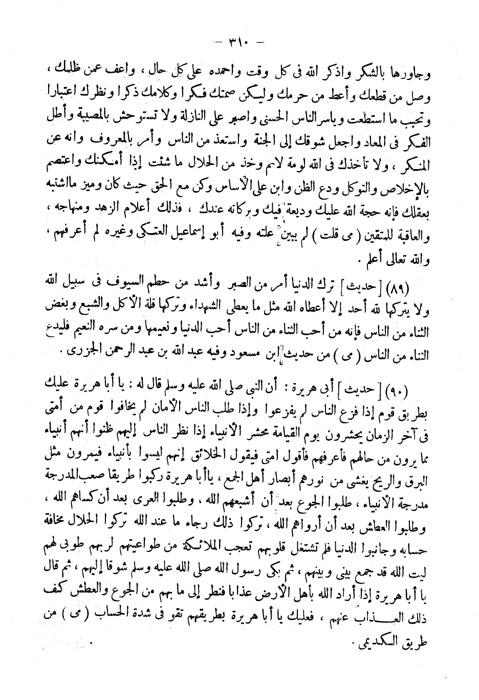 (90) [حَدِيثُ] أبي هُرَيْرَة: أَن النَّبِي قَالَ لَهُ: يَا أَبَا هُرَيْرَةَ عَلَيْكَ بِطَرِيقِ قَوْمٍ إِذَا فَزِعَ النَّاسُ لَمْ يَفْزَعُوا وَإِذَا طَلَبَ النَّاسُ الأَمَانَ لَمْ يَخَافُوا قَوْمٌ مِنْ أُمَّتِي فِي آخِرِ الزَّمَانِ يُحْشَرُونَ يَوْمَ الْقِيَامَةِ مَحْشَرَ الأَنْبِيَاءِ إِذَا نَظَرَ النَّاسُ إِلَيْهِمْ ظَنُّوا أَنَّهُمْ أَنْبِيَاءُ مِمَّا يَرَوْنَ مِنْ حَالِهِمْ فَأَعْرِفُهُمْ فَأَقُولُ أُمَّتِي فَيَقُولُ الْخَلائِقُ إِنَّهُمْ لَيْسُوا بِأَنْبِيَاءَ فَيَمُرُّونَ مِثْلَ الْبَرْقِ وَالرِّيحِ يَغْشَى مِنْ نُورِهِمْ أَبْصَارُ أَهْلِ الْجَمْعِ، يَا أَبَا هُرَيْرَةَ رَكِبُوا طَرِيقًا صَعْبَ الْمَدْرَجَةِ مَدْرَجَةِ الأَنْبِيَاءِ، طَلَبُوا الْجُوعَ بَعْدَ أَنْ أَشْبَعَهُمُ اللَّهُ، وَطَلَبُوا الُعْرَي بَعْد أَنْ كَسَاهُمُ اللَّهُ، وَطَلَبُوا الْعَطَشَ بَعْدَ أَنْ أَرْوَاهُمُ اللَّهُ، تَرَكُوا ذَلِكَ رَجَاءَ مَا عِنْدَ اللَّهِ تَرَكُوا الْحَلالَ مَخَافَةَ حِسَابِهِ وَجَانَبُوا الدُّنْيَا فَلَمْ تَشْتَغِلْ قُلُوبُهُمْ تَعْجَبُ الْمَلائِكَةُ مِنْ طَوَاعِيَتِهِمْ لِرَبِّهِمْ طُوبَى لَهُمْ لَيْتَ اللَّهَ قَدْ جَمَعَ بَيْنِي وَبَيْنَهُمْ، ثُمَّ بَكَى رَسُول الله شَوْقًا إِلَيْهِمْ، ثُمَّ قَالَ يَا أَبَا هُرَيْرَةَ إِذَا أَرَادَ اللَّهُ بِأَهْلِ الأَرْضِ عَذَابًا فَنَظَرَ إِلَى مَا بِهِمْ مِنَ الْجُوعِ وَالْعَطَشِ كَفَّ ذَلِكَ الْعَذَابَ عَنْهُمْ، فَعَلَيْكَ يَا أَبَا هُرَيْرَةَ بِطَرِيقِهِمْ تَقْوَ فِي شِدَّةِ الْحِسَابِ (مي) من طَرِيق الْكُدَيْمِي.