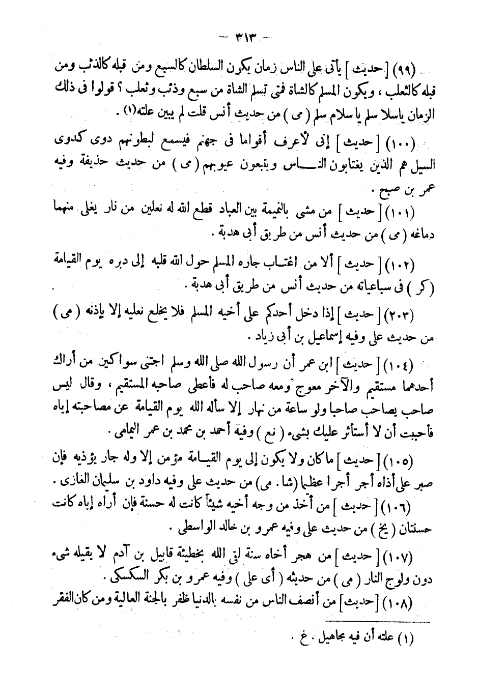 (99) [حَدِيثٌ] يَأْتِي عَلَى النَّاسِ زَمَانٌ يَكُونُ السُّلْطَانُ كَالسَّبُعِ وَمَنْ قِبَلُهُ كَالذِّئْبِ وَمَنْ قِبَلُهُ كَالثَّعْلَبِ، وَيَكُونُ الْمُسْلِمُ كَالشَّاةِ فَمَتَى تَسْلَمُ الشَّاةُ مِنَ سَبُعٍ وَذِئْبٍ وَثَعْلَبٍ؟ قُولُوا فِي ذَلِكَ الزَّمَانِ يَا سَلامُ سَلِّمْ يَا سَلامُ سَلِّمْ (مي) من حَدِيث أنس قلت لم يبين علته.
