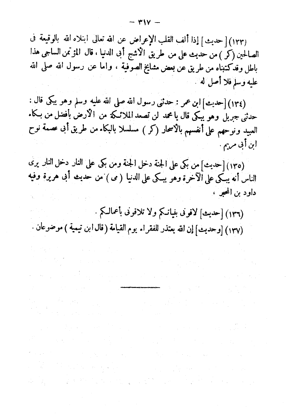(134) [حَدِيثُ] ابْنِ عمر: حَدثنِي رَسُول الله وَهُوَ يَبْكِي قَالَ: حَدَّثَنِي جِبْرِيلُ وَهُوَ يَبْكِي قَالَ يَا مُحَمَّدُ لَنْ تَصْعَدَ الْمَلائِكَةُ مِنَ الأَرْضِ بِأَفْضَلَ مِنْ بُكَاءِ الْعَبِيدِ وَنَوْحِهِمْ عَلَى أَنْفُسِهِمْ بِالأَسْحَارِ (كرّ) مسلسلا بالبكاء من طَرِيق أبي عصمَة نوح ابْن أبي مَرْيَم.