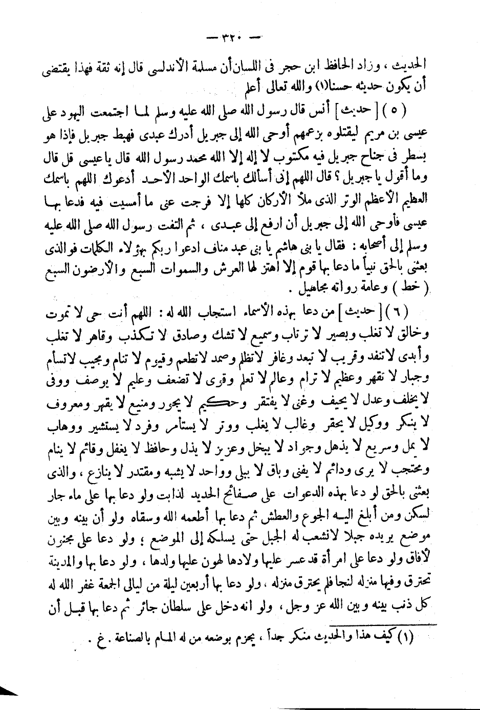 (5) [حَدِيثُ] أَنَسٍ قَالَ رَسُول الله لَمَّا اجْتَمَعَتِ الْيَهُودُ عَلَى عِيسَى بن مَرْيَمَ لِيَقْتُلُوهُ بِزَعْمِهِمْ أَوْحَى اللَّهُ إِلَى جِبْرِيلَ أَدْرِكْ عَبْدِي فَهَبَطَ جِبْرِيلُ فَإِذَا هُوَ بِسَطْرٍ فِي جَنَاحِ جِبْرِيلَ فِيهِ مَكْتُوبٌ لَا إِلَه إِلَّا الله مُحَمَّد رَسُول اللَّهِ قَالَ يَا عِيسَى قُلْ قَالَ وَمَا أَقُولُ يَا جِبْرِيلُ؟ قَالَ اللَّهُمَّ إِنِّي أَسْأَلُكَ بِاسْمِكَ الْوَاحِدِ الأَحَدِ أَدْعُوكَ اللَّهُمَّ بِاسْمِكَ الْعَظِيمِ الأَعْظَمِ الْوِتْرِ الَّذِي مَلأَ الأَرْكَانَ كُلَّهَا إِلا فَرَّجْتَ عَنِّي مَا أَمْسَيْتُ فِيهِ فَدَعَا بِهَا عِيسَى فَأَوْحَى اللَّهُ إِلَى جِبْرِيلَ أَنِ ارْفَعْ إِلَيَّ عَبْدِي، ثُمَّ الْتفت رَسُول الله إِلَى أَصْحَابِهِ: فَقَالَ يَا بَنِي هَاشِمٍ يَا بَنِي عَبْدِ مَنَافٍ ادْعُوا رَبَّكُمْ بِهَؤُلاءِ الْكَلِمَاتِ فَوَالَّذِي بَعَثَنِي بِالْحَقِّ نَبِيًّا مَا دَعَا بِهَا قَوْمٌ إِلا اهْتَزَّ لَهَا الْعَرْشُ وَالسَّمَوَاتُ السَّبْعُ وَالأَرَضُونَ السَّبْعُ (خطّ) وَعَامة رُوَاته مَجَاهِيل.