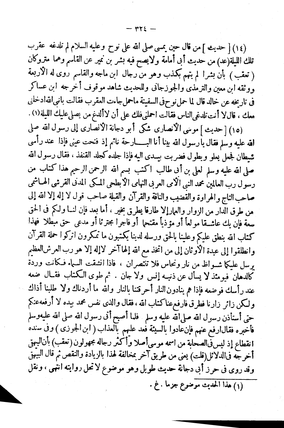 (15) [حَدِيثُ] مُوسَى الأَنْصَارِيِّ شَكَى أَبُو دُجَانَةَ الأَنْصَارِيُّ إِلَى رَسُول الله فَقَالَ يَا رَسُولَ اللَّهِ بَيْنَا أَنَا الْبَارِحَةَ نَائِمٌ إِذَا فَتَّحْتُ عَيْنِي فَإِذَا عِنْدَ رَأْسِي شَيْطَانٌ فَجَعَل يَعْلُو وَيَطُولُ فَضَرَبْتُ بِيَدِي إِلَيْهِ فَإِذا جلده كلجد الْقُنْفُذ، فَقَالَ رَسُول الله لِعَلِيِّ بْنِ أَبِي طَالِبٍ اكْتُبْ بِسْمِ اللَّهِ الرَّحْمَنِ الرَّحِيمِ هَذَا كِتَابٌ مِنْ رَسُولِ رَبِّ الْعَالَمِينَ مُحَمَّدٍ النَّبِيِّ الأُمِّيِّ الْعَرَبِيِّ التِّهَامِيِّ الأَبْطَحِيِّ الْمَكِّيِّ الْمَدَنِيِّ الْقُرَشِيِّ الْهَاشِمِيِّ صَاحِبِ التَّاجِ وَالْهِرَاوَةِ وَالْقَضِيبِ وَالنَّاقَةِ وَالْقُرْآنِ وَالْقِبْلَةِ صَاحِبِ قَوْلِ لَا إِلَهَ إِلا اللَّهُ إِلَى مَنْ طَرَقَ الدَّارَ مِنَ الزُّوَّارِ وَالْعُمَّارِ إِلا طَارِقًا يَطْرُقُ بِخَيْرٍ، أَمَّا بَعْدُ فَإِنَّ لَنَا وَلَكُمْ فِي الْحَقِّ سَعَةً فَإِنْ يَكُ عَاشِقًا مُولَعًا أَوْ مُؤْذِيًا مُقْتَحِمًا أَوْ فَاجِرًا مُجْتَرِئًا أَوْ مُدَّعِيَ حَقٍّ مُبْطِلا فَهَذَا كِتَابُ اللَهِ يَنْطِقُ عَلَيْكُمْ وَعَلَيْنَا بِالْحَقِّ وَرُسُلُهُ لَدَيْنَا يَكْتُبُونَ مَا تَمْكُرُونَ اتْرُكُوا حَمَلَةَ الْقُرْآنِ وَانْطَلِقُوا إِلَى عَبَدَةِ الأَوْثَانِ إِلَى مَنِ اتَّخَذَ مَعَ اللَّهِ إِلَهًا آخَرَ لَا إِلَهَ إِلا هُوَ رَبُّ الْعَرْشِ الْعَظِيمِ ( {يُرْسَلُ عَلَيْكُمَا شُوَاظٌ مِنْ نَارٍ وَنُحَاسٌ فَلَا تنتصران} فَإِذَا انْشَقَّتِ السَّمَاءُ فَكَانَتْ وَرْدَةً كالدهان) {فَيَوْمَئِذٍ لَا يُسْأَلُ عَنْ ذَنْبِهِ إنس وَلَا جَان} .
