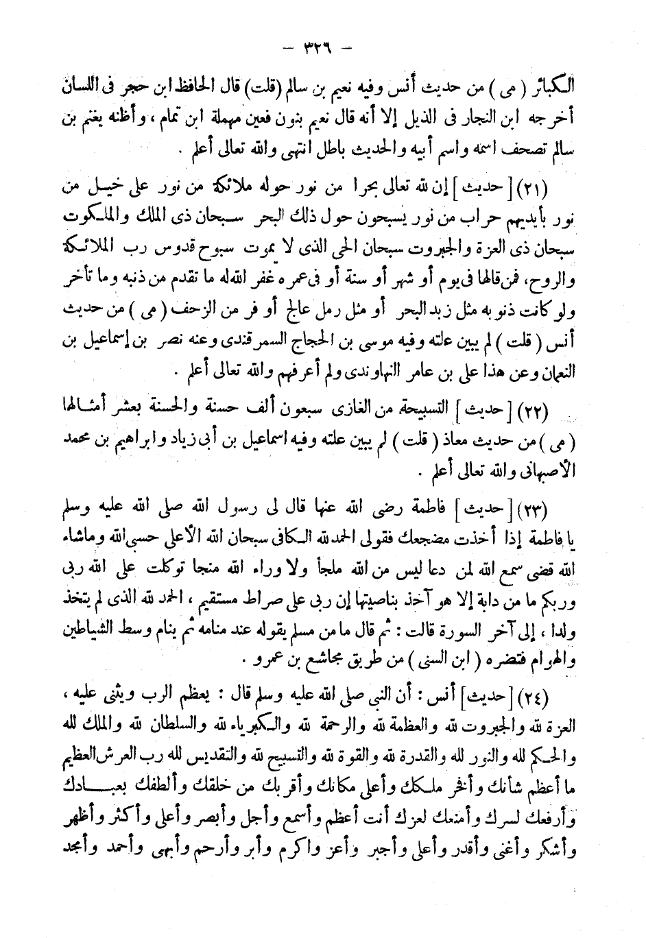 (24) [حَدِيث] أنس: أَن النَّبِي قَالَ: يُعَظَّمُ الرَّبَّ وَيُثْنَى عَلَيْهِ، الْعِزَّةُ لِلَّهِ وَالْجَبَرُوتُ لِلَّهِ وَالْعَظَمَةُ لِلَّهِ وَالرَّحْمَةُ لِلَّهِ وَالْكِبْرِيَاءُ لِلَّهِ وَالسُّلْطَانُ لِلَّهِ وَالْمُلْكُ لِلَّهِ وَالْحُكْمُ لِلَّهِ وَالنُّورُ لِلَّهِ وَالْقُدْرَةُ لِلَّهِ وَالْقُوَّةُ لِلَّهِ وَالتَّسْبِيحُ لِلَّهِ وَالتَّقْدِيسُ لِلَّهِ رَبِّ الْعَرْشِ الْعَظِيمِ مَا أَعْظَمَ شَأْنَكَ وَأَفْخَرَ مُلْكَكَ وَأَعْلَى مَكَانك وأقربك من خَلفك وَأَلْطَفَكَ بِعِبَادِكَ وَأَرْفَعَكَ لِسِرِّكَ وَأَمْنَعَك لِعِزِّكَ أَنْتَ أَعْظَمُ وَأَسْمَعُ وَأَجَلُّ وَأَبْصَرُ وَأَعْلَى وَأَكْثَرُ وَأَظْهَرُ وَأَشْكَرُ وَأَغْنَى وَأَقْدَرُ وَأَعْلَى وَأَجْبَرُ وَأَعَزُّ وَأَكْرَمُ وَأَبَرُّ وَأَرْحَمُ وَأَبْهَى وَأَحْمَدُ وأمجد