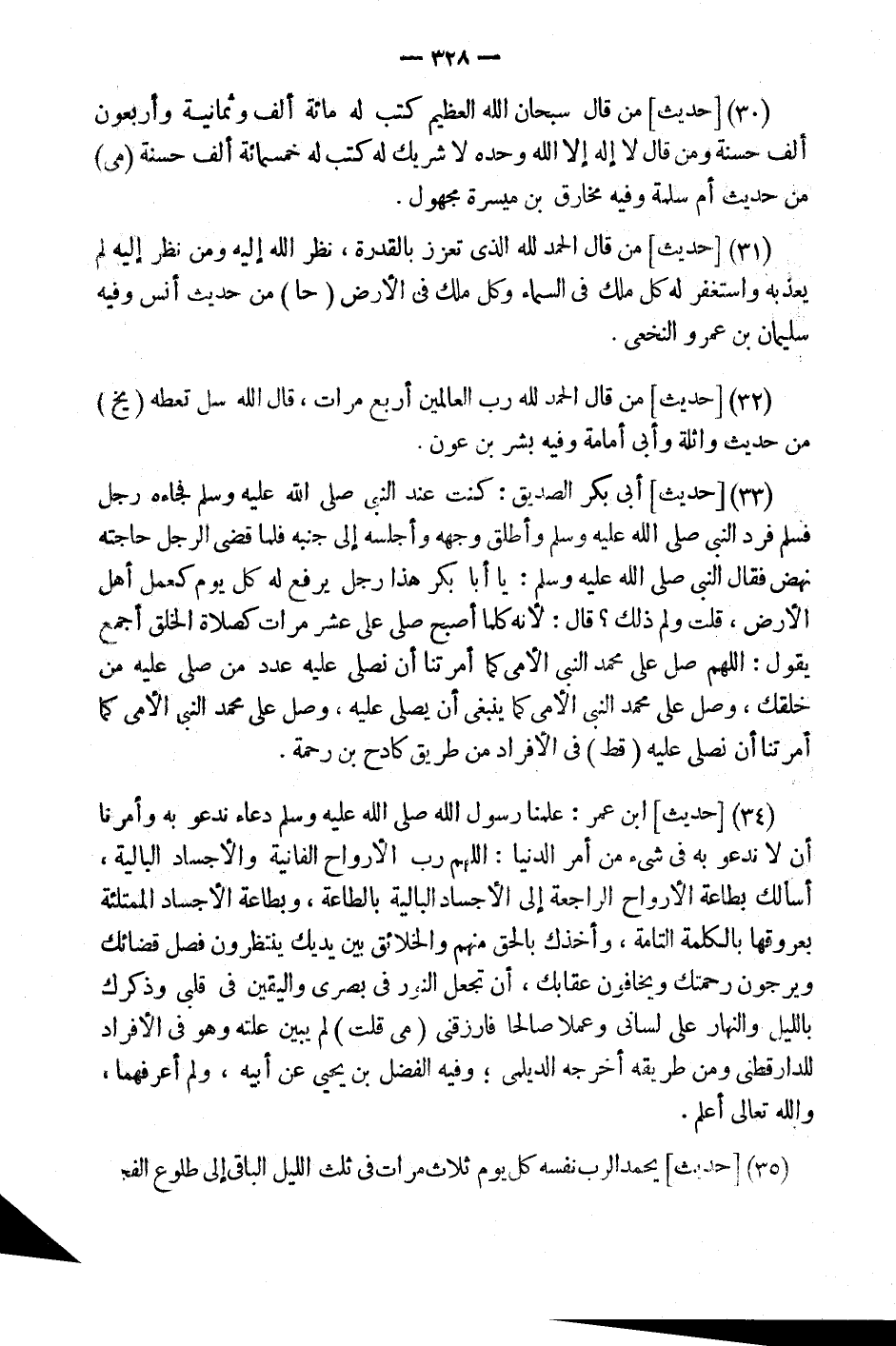 (33) [حَدِيثُ] أَبِي بَكْرٍ الصِّدِّيقِ: كُنْتُ عِنْد النَّبِي فَجَاءَهُ رَجُلٌ فَسَلَّمَ فَرَدَّ النَّبِيُّ وَأَطْلَقَ وَجْهَهُ وَأَجْلَسَهُ إِلَى جَنْبِهِ فَلَمَّا قَضَى الرَّجُلُ حَاجَتَهُ نَهَضَ فَقَالَ النَّبِي: يَا أَبَا بَكْرٍ هَذَا رَجُلٌ يُرْفَعُ لَهُ كُلَّ يَوْمٍ كَعَمَلِ أَهْلِ الأَرْضِ، قُلْتُ وَلِمَ ذَلِكَ؟ قَالَ: لأَنَّهُ كُلَّمَا أَصْبَحَ صَلَّى عَلَيَّ عَشْرَ مَرَّاتٍ كَصَلاةِ الْخَلْقِ أَجْمَعَ يَقُولُ: اللَّهُمَّ صَلِّ عَلَى مُحَمَّدٍ النَّبِيِّ الأُمِّيِّ كَمَا أَمَرْتَنَا أَنْ نُصَلِّيَ عَلَيْهِ عَدَدَ مَنْ صَلَّى عَلَيْهِ مِنْ خَلْقِكَ، وَصَلِّ عَلَى مُحَمَّدٍ النَّبِيِّ الأُمِّيِّ كَمَا يَنْبَغِي أَنْ يُصَلَّى عَلَيْهِ، وَصَلِّ عَلَى مُحَمَّدٍ النَّبِيِّ الأُمِّيِّ كَمَا أمترنا أَنْ نُصَلِّيَ عَلَيْهِ (قطّ) فِي الْأَفْرَاد من طَرِيق كَادِح بن رَحْمَة.