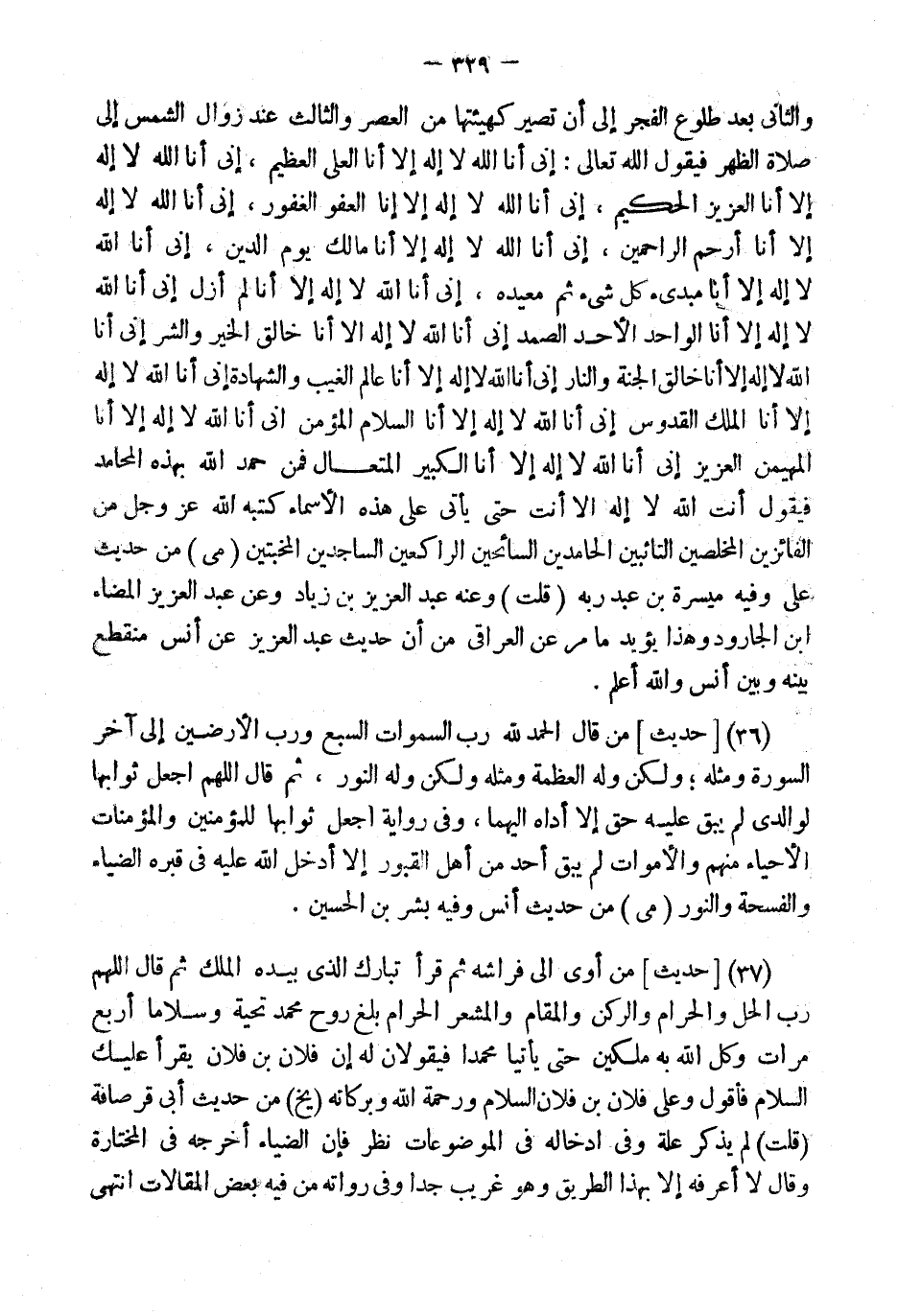 (36) [حَدِيثٌ] مَنْ قَالَ {الْحَمْدُ لِلَّهِ رَبِّ السَّمَوَاتِ السَّبْعِ وَرَبِّ الأَرَضِينَ} إِلَى آخِرِ السُّورَةِ وَمِثْلِهِ؛ وَلَكِنْ وَلَهُ الْعَظَمَةُ وَمِثْلُهُ وَلَكِنْ وَلَهُ النُّورُ، ثُمَّ قَالَ اللَّهُمَّ اجْعَلْ ثَوَابَهَا لِوَالِدَيَّ لَمْ يَبْقَ عَلَيْهِ حَقٌّ إِلا أَدَّاهُ إِلَيْهِمَا، وَفِي رِوَايَة اجْعَل ثَوَابهَا للْمُؤْمِنين وَالْمُؤْمِنَات الْأَحْيَاء مِنْهُم والأموات لم يبْق أحد من أهل الْقُبُور إِلَّا أَدخل الله عَلَيْهِ فِي قَبره الضياء والفسحة والنور (مي) من حَدِيث أنس وَفِيه بشر بن الْحُسَيْن.