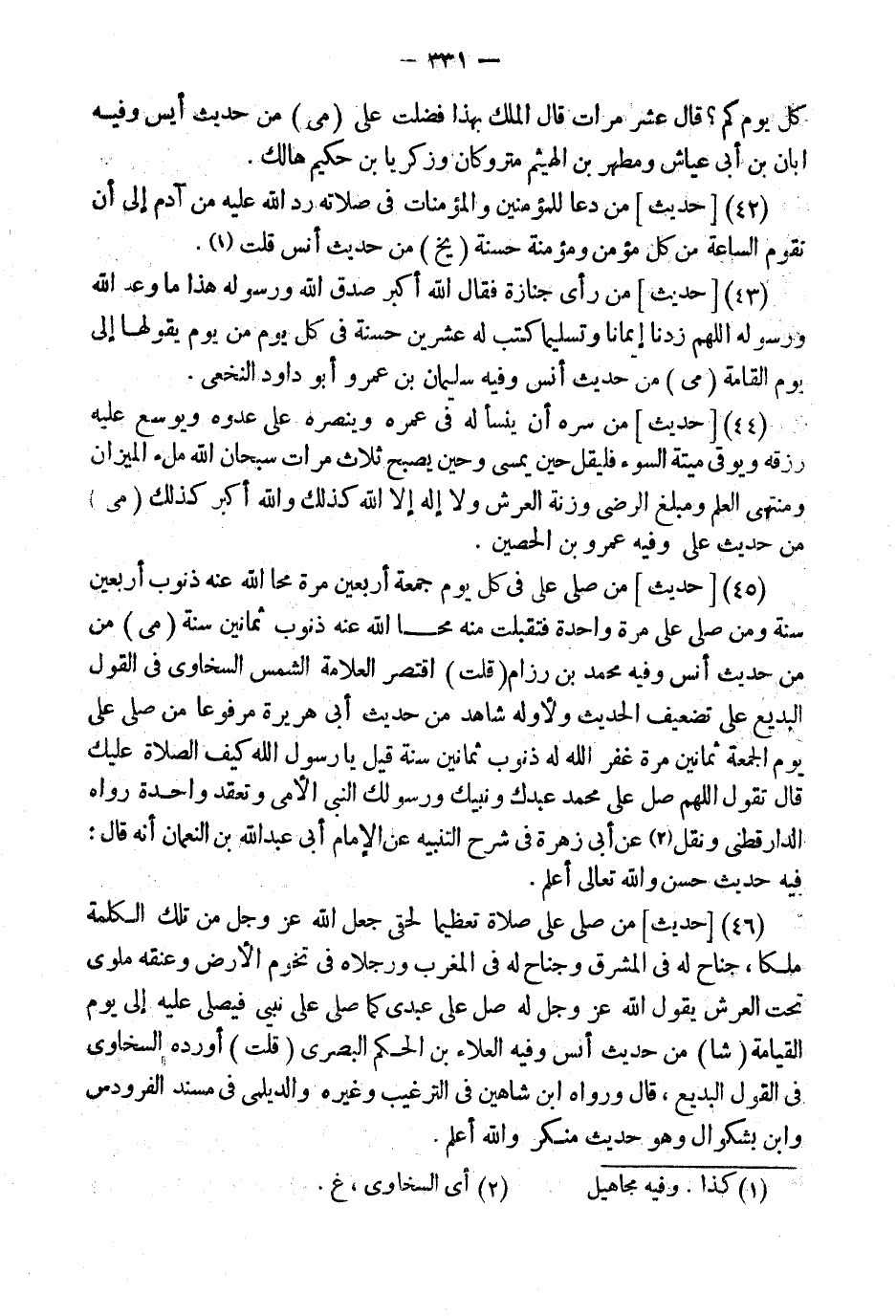 (45) [حَدِيثٌ] مَنْ صَلَّى عَلَيَّ فِي كُلِّ يَوْمِ جُمُعَةٍ أَرْبَعِينَ مَرَّةً مَحَا اللَّهُ عَنْهُ ذُنُوبَ أَرْبَعِينَ سَنَةً وَمَنْ صَلَّى عَلَيَّ مَرَّةً وَاحِدَةً فَتُقُبِّلَتْ مِنْهُ مَحَا اللَّهُ عَنْهُ ذُنُوبَ ثَمَانِينَ سَنَةً (مي) من حَدِيث أنس وَفِيه مُحَمَّد بن رزام (قلت) اقْتصر الْعَلامَة الشَّمْس السخاوي فِي القَوْل البديع على تَضْعِيف الحَدِيث ولأوله شَاهد من حَدِيث أبي هُرَيْرَة مَرْفُوعا من صلى عَليّ يَوْم الْجُمُعَة ثَمَانِينَ مرّة غفر الله لَهُ ذنُوب ثَمَانِينَ سنة قيل يَا رَسُول الله كَيفَ الصَّلَاة عَلَيْك قَالَ تَقول اللَّهُمَّ صل على مُحَمَّد عَبدك وَنَبِيك وَرَسُولك النَّبِي الْأُمِّي وتعقد وَاحِدَة رَوَاهُ الدَّارَقُطْنِيّ وَنقل عَن أبي هُرَيْرَة فِي شرح التَّنْبِيه عَن الإِمَام أبي عبد الله بن النُّعْمَان أَنه قَالَ: فِيهِ حَدِيث حسن والله تَعَالَى أعلم.