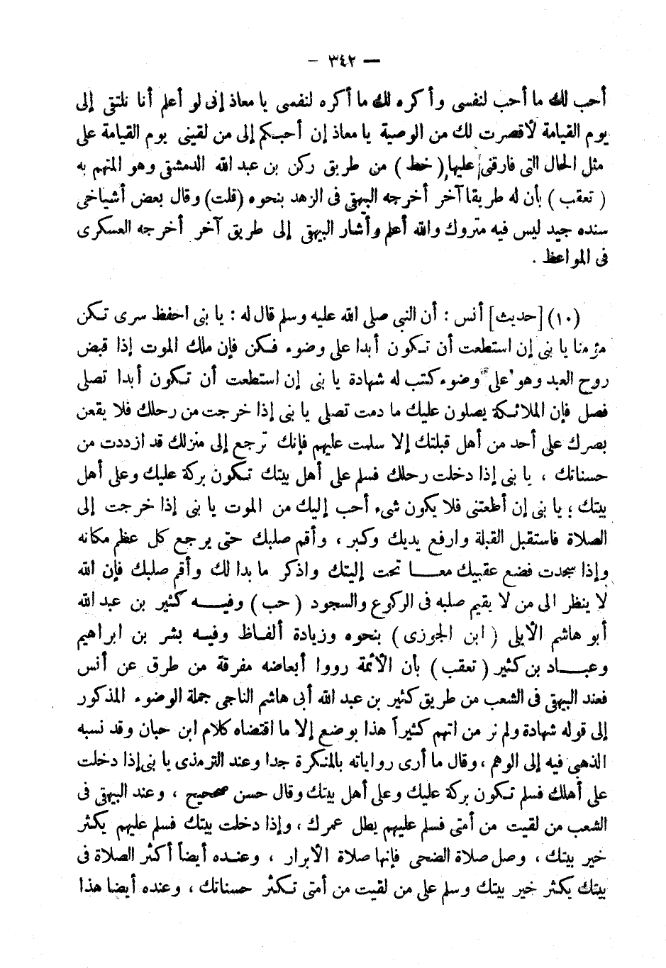 (10) [حَدِيث] أنس: أَن النَّبِي قَالَ لَهُ: يَا بُنَيَّ احْفَظْ سِرِّي تَكُنْ مُؤْمِنًا يَا بُنَيَّ إِنِ اسْتَطَعْتَ أَنْ تَكُونَ أَبَدًا عَلَى وُضُوءٍ فَكُنْ فَإِنَّ مَلَكَ الْمَوْتِ إِذَا قَبَضَ رُوحَ الْعَبْدِ وَهُوَ عَلَى وُضُوءٍ كَتَبَ لَهُ شَهَادَةً يَا بُنَيَّ إِنِ اسْتَطَعْتَ أَنْ تَكُونَ أَبَدًا تُصَلِّي فَصَلِّ فَإِنَّ الْمَلائِكَةَ يُصَلُّونَ عَلَيْكَ مَا دُمْتَ تُصَلِّي يَا بُنَيَّ إِذَا خَرَجْتَ مِنْ رَحْلِكَ فَلا يَقَعَنَّ بَصَرُكَ عَلَى أَحَدٍ مِنْ أَهْلِ قِبْلَتِكَ إِلا سَلَّمْتَ عَلَيْهِمْ فَإِنَّكَ تَرْجِعُ إِلَى مَنْزِلِكَ قَدِ ازْدَدْتَ مِنْ حَسَنَاتِكَ، يَا بُنَيَّ إِذَا دَخَلْتَ رَحْلَكَ فَسَلِّمْ عَلَى أَهْلِ بَيْتِكَ تَكُونُ بَرَكَةٌ عَلَيْكَ وَعَلَى أَهْلِ بَيْتِكَ؛ يَا بُنَيَّ إِنْ أَطَعْتَنِي فَلا يَكُونُ شَيْءٌ أَحَبَّ إِلَيْكَ مِنَ الْمَوْتِ يَا بُنَيَّ إِذَا خَرَجْتَ إِلَى الصَّلاةِ فَاسْتَقْبِلِ الْقِبْلَةَ وَارْفَعْ يَدَيْكَ وَكَبِّرْ، وَأَقِمْ صُلْبَكَ حَتَّى يَرْجِعَ كُلُّ عَظْمٍ مَكَانَهُ وَإِذَا سَجَدْتَ فَضَعْ عَقِبَيْكَ مَعًا تَحْتَ إِلْيَتِكَ وَاذْكُرْ مَا بَدَا لَكَ وَأَقِمْ صُلْبَكَ فَإِنَّ اللَّهَ لَا يَنْظُرُ إِلَى مَنْ لَا يُقِيمُ صُلْبَهُ فِي الرُّكُوعِ وَالسُّجُودِ (حب) وَفِيه كثير بن عبد الله أَبُو هَاشم الْأَيْلِي (ابْن الْجَوْزِيّ) بِنَحْوِهِ وَزِيَادَة أَلْفَاظ وَفِيه بشر بن إِبْرَاهِيم وَعباد بن كثير (تعقب) بِأَن الْأَئِمَّة رووا أَبْعَاضه مفرقة من طرق عَن أنس فَعِنْدَ الْبَيْهَقِيّ فِي الشّعب من طَرِيق كثير بن عبد الله أبي هَاشم النَّاجِي جملَة الْوضُوء الْمَذْكُور إِلَى قَوْله شَهَادَة وَلم نر من اتهمَ كثيرا هَذَا بِوَضْع إِلَّا مَا اقْتَضَاهُ كَلَام ابْن حبَان وَقد نسبه الذَّهَبِيّ فِيهِ إِلَى الْوَهم، وَقَالَ مَا أرى رواياته بالمنكرة جدا وعِنْد التِّرْمِذِيّ يَا بني إِذا دخلت على أهلك فَسلم تكون بركَة عَلَيْك وعَلى أهل بَيْتك وَقَالَ حسن صَحِيح، وَعند الْبَيْهَقِيّ فِي الشّعب من لقِيت من أمتِي فَسلم عَلَيْهِم يطلّ عمرك، وَإِذا دخلت بَيْتك فَسلم عَلَيْهِم يكثر خير بَيْتك، وصل صَلَاة الضُّحَى فَإِنَّهَا صَلَاة الْأَبْرَار، وَعِنْده أَيْضا أَكثر الصَّلَاة فِي بَيْتك يكثر خير بَيْتك وَسلم على من لقِيت من أمتِي تكْثر حَسَنَاتك، وَعِنْده أَيْضا هَذَا