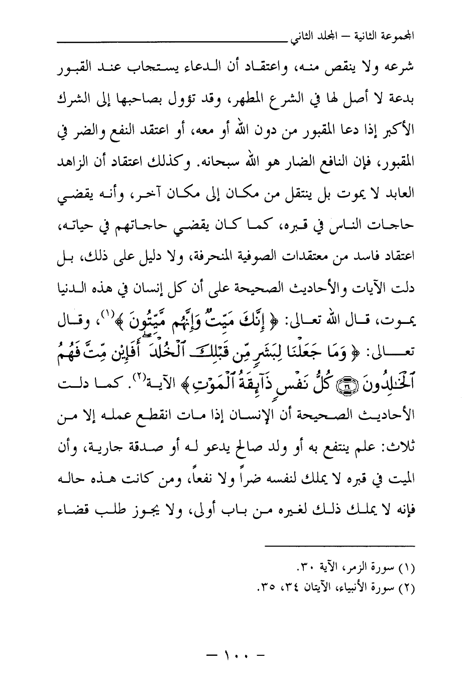 شرعه ولا ينقص منه، واعتقاد أن الدعاء يستجاب عند القبور بدعة لا أصل لها في الشرع المطهر، وقد تؤول بصاحبها إلى الشرك الأكبر إذا دعا المقبور من دون الله أو معه، أو اعتقد النفع والضر في المقبور، فإن النافع الضار هو الله سبحانه. وكذلك اعتقاد أن الزاهد العابد لا يموت بل ينتقل من مكان إلى مكان أخر، وأنه يقضي حاجات الناس في قبره، كما كان يقضي حاجاتهم في حياته، اعتقاد فاسد من معتقدات الصوفية المنحرفة، ولا دليل على ذلك، بل دلت الآيات والأحاديث الصحيحة على أن كل إنسان في هذه الدنيا يموت، قال الله تعالى: {إِنَّكَ مَيِّتٌ وَإِنَّهُمْ مَيِّتُونَ} (¬1) ، وقال تعالى: {وَمَا جَعَلْنَا لِبَشَرٍ مِنْ قَبْلِكَ الْخُلْدَ أَفَإِنْ مِتَّ فَهُمُ الْخَالِدُونَ} (¬2) {كُلُّ نَفْسٍ ذَائِقَةُ الْمَوْتِ} (¬3) الآية. كما دلت الأحاديث الصحيحة أن الإنسان إذا مات انقطع عمله إلا من ثلاث: علم ينتفع به أو ولد صالح يدعو له أو صدقة جارية، وأن الميت في قبره لا يملك لنفسه ضرا ولا نفعا، ومن كانت هذه حاله فإنه لا يملك ذلك لغيره من باب أولى، ولا يجوز طلب قضاء