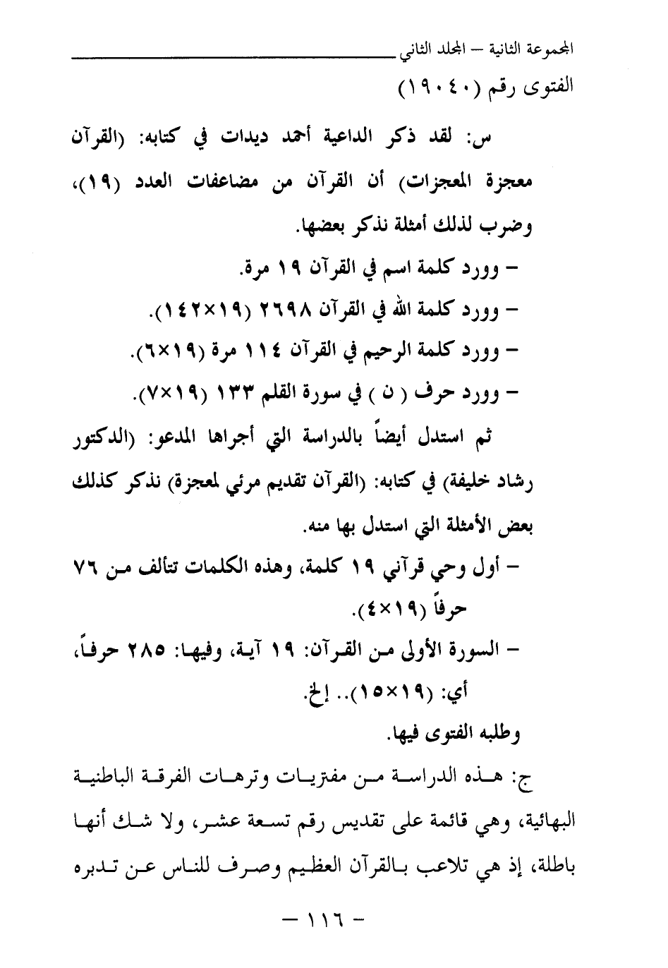 ج: هذه الدراسة من مفتريات وترهات الفرقة الباطنية البهائية، وهي قائمة على تقديس رقم تسعة عشر، ولا شك أنها باطلة، إذ هي تلاعب بالقرآن العظيم وصرف للناس عن تدبره