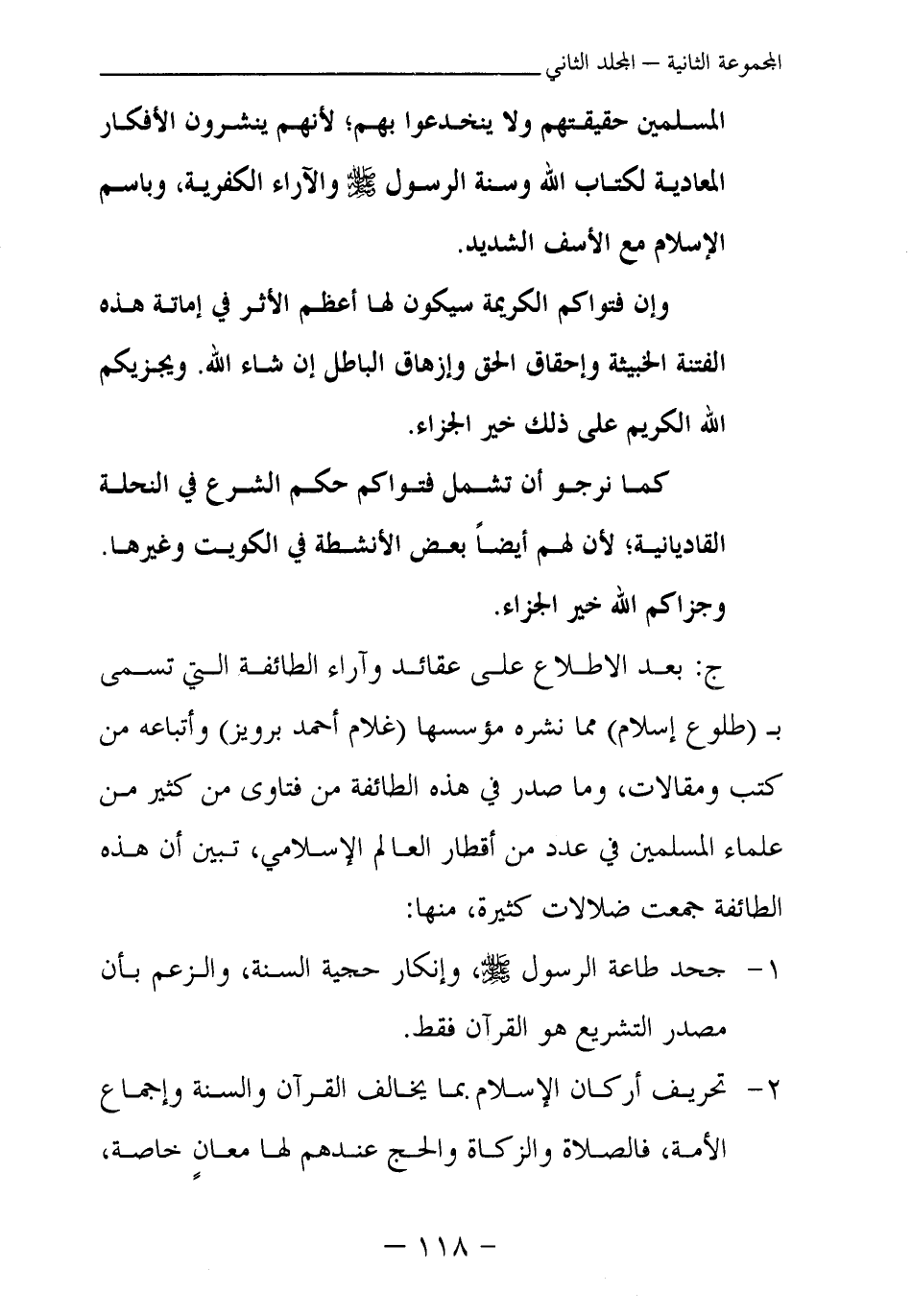 ج: بعد الاطلاع على عقائد وآراء الطائفة التي تسمى بـ (طلوع إسلام) مما نشره مؤسسها (غلام أحمد برويز) وأتباعه من كتب ومقالات، وما صدر في هذه الطائفة من فتاوى من كثير من علماء المسلمين في عدد من أقطار العالم الإسلامي، تبين أن هذه الطائفة جمعت ضلالات كثيرة، منها: