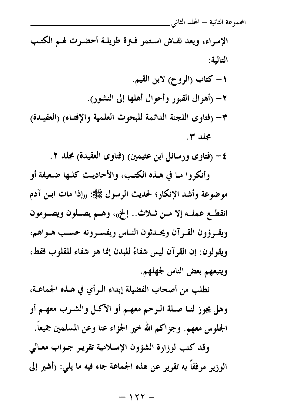 وأنكروا ما في هذه الكتب، والأحاديث كلها ضعيفة أو موضوعة، وأشد الإنكار؛ لحديث الرسول صلى الله عليه وسلم: «إذا مات ابن آدم انقطع عمله إلا من ثلاث (¬1) » . . إلخ، وهم يصلون ويصومون ويقرؤون القرآن ويحدثون الناس ويفسرونه حسب هواهم، ويقولون: إن القرآن ليس شفاء للبدن إنما هو شفاء للقلوب فقط، ويتبعهم بعض الناس لجهلهم.