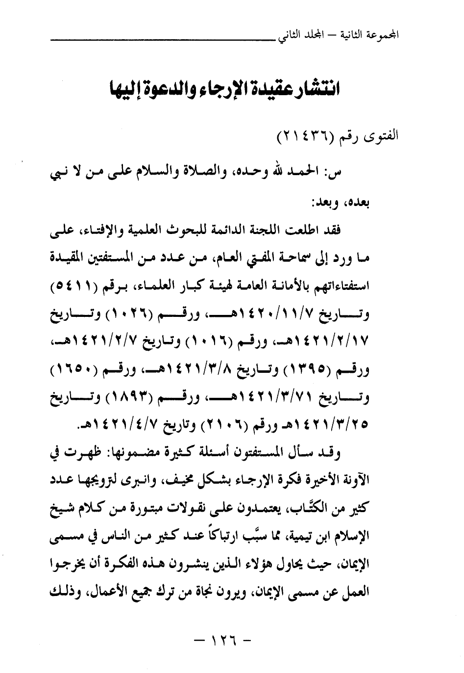 وقد سأل المستفتون أسئلة كثيرة مضمونها: ظهرت في الآونة الأخيرة فكرة الإرجاء بشكل مخيف، وانبرى لترويجها عدد كثير من الكتاب، يعتمدون على نقولات مبتورة من كلام شيخ الإسلام ابن تيمية، مما سبب ارتباكا عند كثير من الناس في مسمى الإيمان، حيث يحاول هؤلاء الذين ينشرون هذه الفكرة أن يخرجوا العمل عن مسمى الإيمان، ويرون نجاة من ترك جميع الأعمال، وذلك