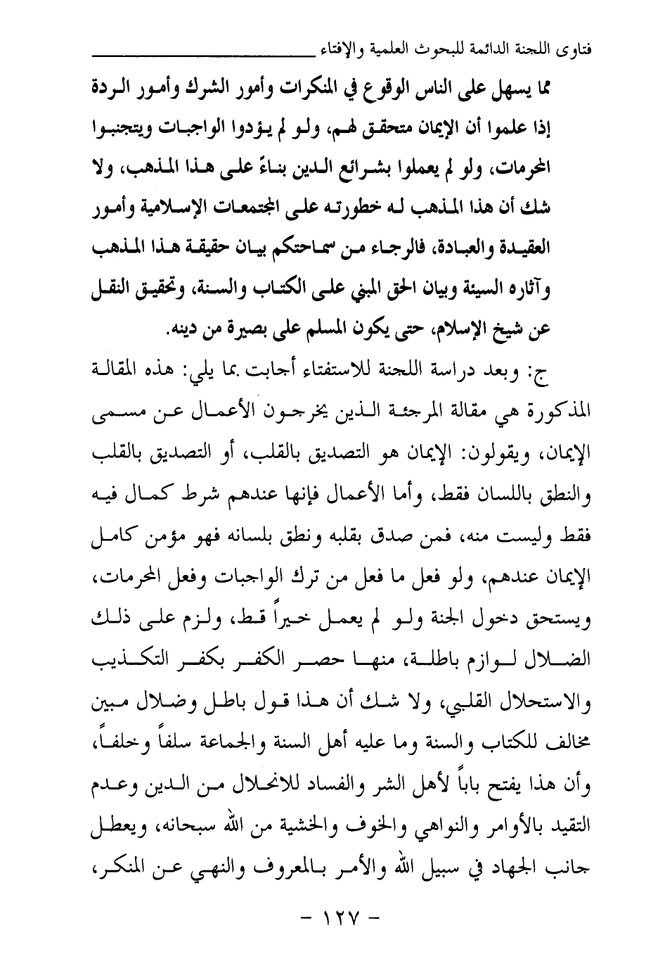ج: وبعد دراسة اللجنة للاستفتاء أجابت بما يلي: هذه المقالة المذكورة هي مقالة المرجئة الذين يخرجون الأعمال عن مسمى الإيمان، ويقولون: الإيمان هو التصديق بالقلب، أو التصديق بالقلب والنطق باللسان فقط، وأما الأعمال فإنها عندهم شرط كمال فيه فقط وليست منه، فمن صدق بقلبه ونطق بلسانه فهو مؤمن كامل الإيمان عندهم، ولو فعل ما فعل من ترك الواجبات وفعل المحرمات، ويستحق دخول الجنة ولو لم يعمل خيرا قط، ولزم على ذلك الضلال لوازم باطلة، منها حصر الكفر بكفر التكذيب والاستحلال القلبي، ولا شك أن هذا قول باطل وضلال مبين مخالف للكتاب والسنة وما عليه أهل السنة والجماعة سلفا وخلفا، وأن هذا يفتح بابا لأهل الشر والفساد للانحلال من الدين وعدم التقيد بالأوامر والنواهي والخوف والخشية من الله سبحانه، ويعطل جانب الجهاد في سبيل الله والأمر بالمعروف والنهي عن المنكر،