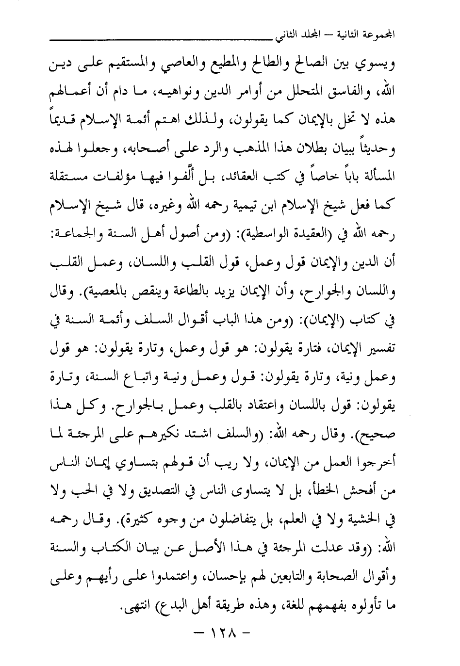 ويسوي بين الصالح والطالح والمطيع والعاصي والمستقيم على دين الله، والفاسق المتحلل من أوامر الدين ونواهيه، ما دام أن أعمالهم هذه لا تخل بالإيمان كما يقولون، ولذلك اهتم أئمة الإسلام قديما وحديثا ببيان بطلان هذا المذهب والرد على أصحابه، وجعلوا لهذه المسألة بابا خاصا في كتب العقائد، بل ألفوا فيها مؤلفات مستقلة كما فعل شيخ الإسلام ابن تيمية رحمه الله وغيره، قال شيخ الإسلام رحمه الله في (العقيدة الواسطية) : (ومن أصول أهل السنة والجماعة: أن الدين والإيمان قول وعمل، قول القلب واللسان، وعمل القلب واللسان والجوارح، وأن الإيمان يزيد بالطاعة وينقص بالمعصية) . وقال في كتاب (الإيمان) : (ومن هذا الباب أقوال السلف وأئمة السنة في تفسير الإيمان، فتارة يقولون: هو قول وعمل، وتارة يقولون: هو قول وعمل ونية، وتارة يقولون: قول وعمل ونية واتباع السنة، وتارة يقولون: قول باللسان واعتقاد بالقلب وعمل بالجوارح. وكل هذا صحيح) . وقال رحمه الله: (والسلف اشتد نكيرهم على المرجئة لما أخرجوا العمل من الإيمان، ولا ريب أن قولهم بتساوي إيمان الناس من أفحش الخطأ، بل لا يتساوى الناس في التصديق ولا في الحب ولا في الخشية ولا في العلم، بل يتفاضلون من وجوه كثيرة) . وقال رحمه الله: (وقد عدلت المرجئة في هذا الأصل عن بيان الكتاب والسنة وأقوال الصحابة والتابعين لهم بإحسان، واعتمدوا على رأيهم وعلى ما تأولوه بفهمهم للغة، وهذه طريقة أهل البدع) انتهى.