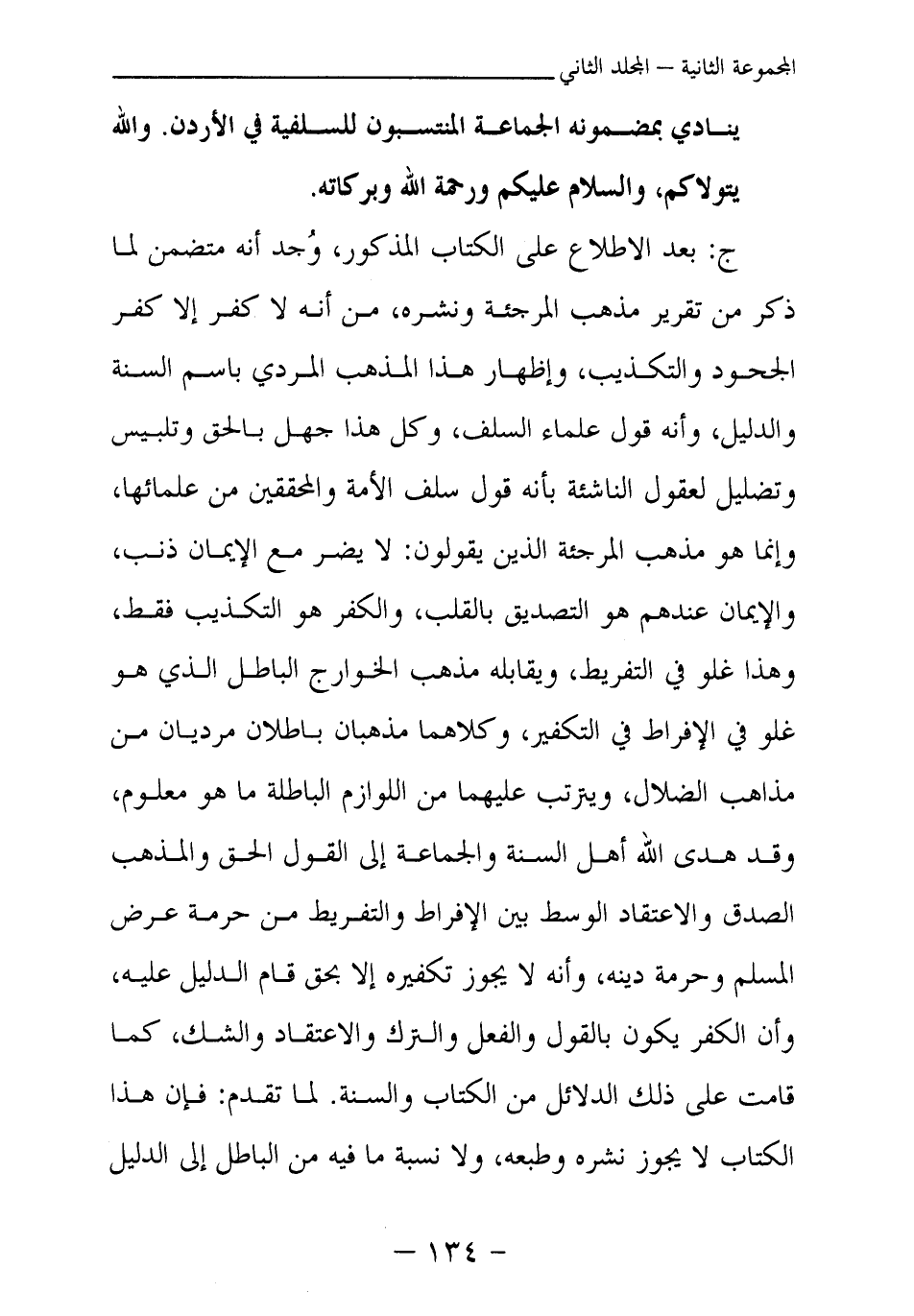 ج: بعد الاطلاع على الكتاب المذكور، وجد أنه متضمن لما ذكر من تقرير مذهب المرجئة ونشره، من أنه لا كفر إلا كفر الجحود والتكذيب، وإظهار هذا المذهب المردي باسم السنة والدليل، وأنه قول علماء السلف، وكل هذا جهل بالحق وتلبيس وتضليل لعقول الناشئة بأنه قول سلف الأمة والمحققين من علمائها، وإنما هو مذهب المرجئة الذين يقولون: لا يضر مع الإيمان ذنب، والإيمان عندهم هو التصديق بالقلب، والكفر هو التكذيب فقط، وهذا غلو في التفريط، ويقابله مذهب الخوارج الباطل الذي هو غلو في الإفراط في التكفير، وكلاهما مذهبان باطلان مرديان من مذاهب الضلال، ويترتب عليهما من اللوازم الباطلة ما هو معلوم، وقد هدى الله أهل السنة والجماعة إلى القول الحق والمذهب الصدق والاعتقاد الوسط بين الإفراط والتفريط من حرمة عرض المسلم وحرمة دينه، وأنه لا يجوز تكفيره إلا بحق قام الدليل عليه، وأن الكفر يكون بالقول والفعل والترك والاعتقاد والشك، كما قامت على ذلك الدلائل من الكتاب والسنة؛ لما تقدم: فإن هذا الكتاب لا يجوز نشره وطبعه، ولا نسبة ما فيه من الباطل إلى الدليل