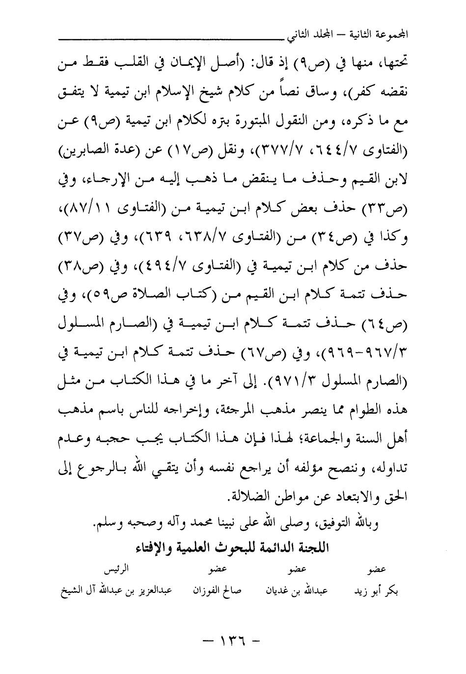 تحتها، منها في (ص 9) إذ قال: (أصل الإيمان في القلب فقط من نقضه كفر) ، وساق نصا من كلام شيخ الإسلام ابن تيمية لا يتفق مع ما ذكره، ومن النقول المبتورة بتره لكلام ابن تيمية (ص 9) عن (الفتاوى 7\ 644، 7\ 377) ، ونقل (ص 17) عن (عدة الصابرين) لابن القيم وحذف ما ينقض ما ذهب إليه من الإرجاء، وفي (ص 33) حذف بعض كلام ابن تيمية من (الفتاوى 11\ 87) ، وكذا في (ص 34) من (الفتاوى 7\ 638، 639) ، وفي (ص 37) حذف من كلام ابن تيمية في (الفتاوى 7\ 494) ، وفي (ص 38) حذف تتمة كلام ابن القيم من (كتاب الصلاة ص 59) ، وفي (ص 64) حذف تتمة كلام ابن تيمية في (الصارم المسلول 3\ 967-969) ، وفي (ص 67) حذف تتمة كلام ابن تيمية في (الصارم المسلول 3\ 971) . إلى آخر ما في هذا الكتاب من مثل هذه الطوام مما ينصر مذهب المرجئة، وإخراجه للناس باسم مذهب أهل السنة والجماعة؛ لهذا فإن هذا الكتاب يجب حجبه وعدم تداوله، وننصح مؤلفه أن يراجع نفسه وأن يتقي الله بالرجوع إلى الحق والابتعاد عن مواطن الضلالة.