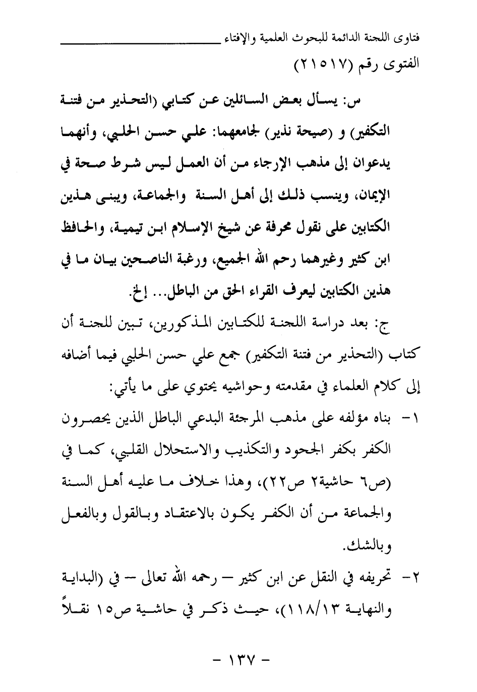 ج: بعد دراسة اللجنة للكتابين المذكورين، تبين للجنة أن كتاب (التحذير من فتنة التكفير) جمع علي حسن الحلبي فيما أضافه إلى كلام العلماء في مقدمته وحواشيه يحتوي على ما يأتي: