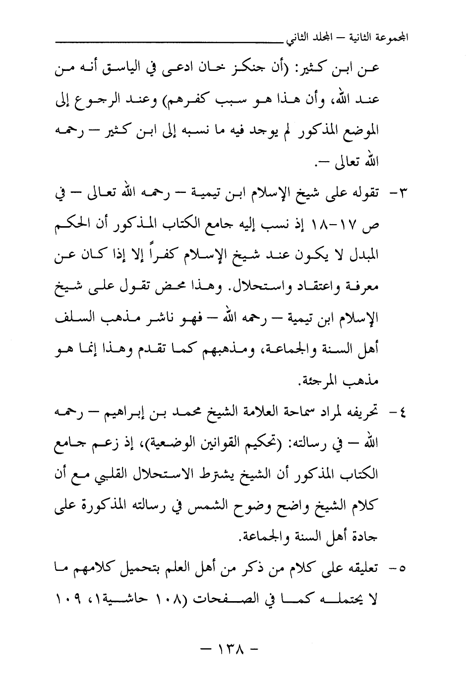 5- تعليقه على كلام من ذكر من أهل العلم بتحميل كلامهم ما لا يحتمله كما في الصفحات (108 حاشية 1، 109