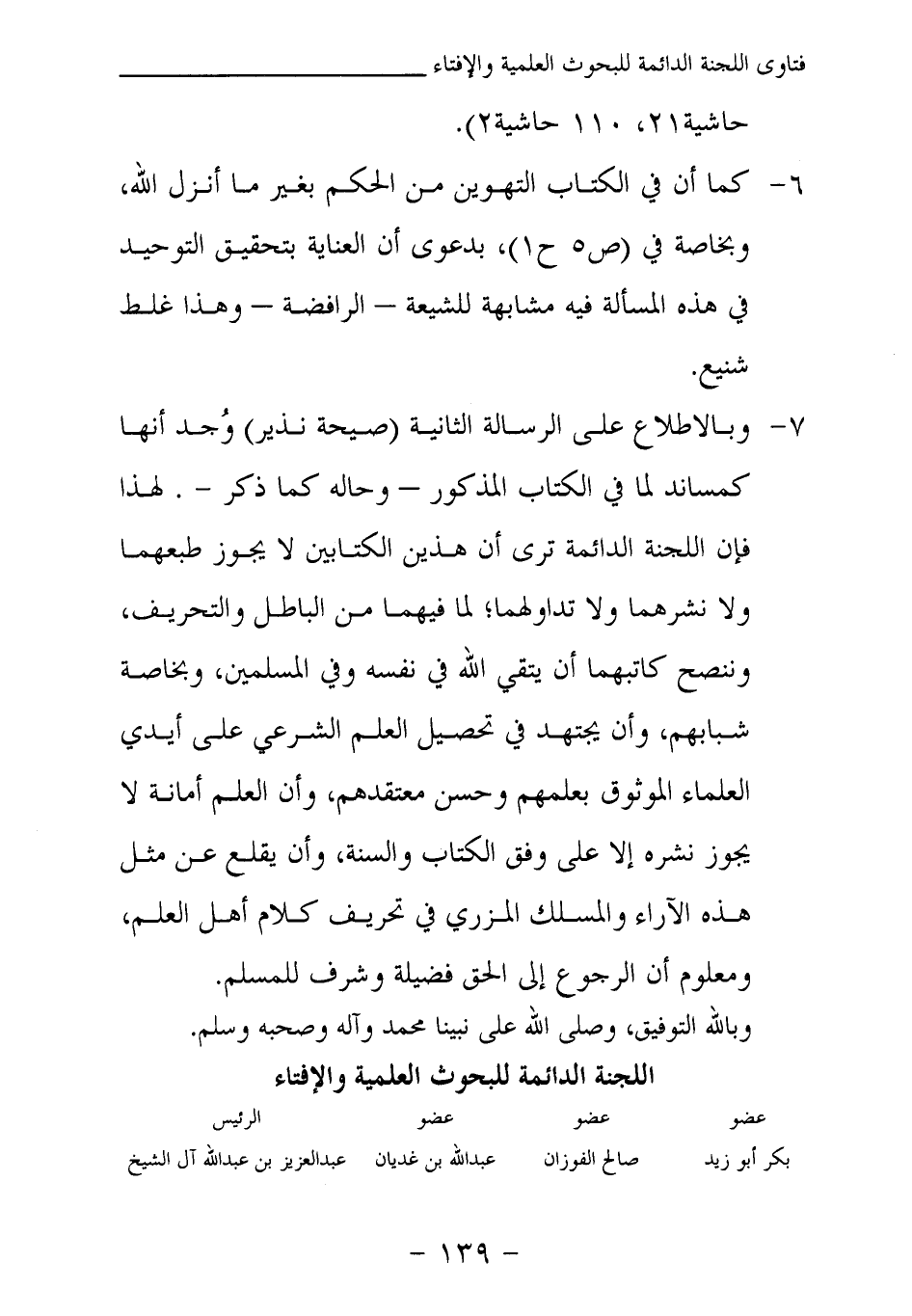 7- وبالاطلاع على الرسالة الثانية (صيحة نذير) وجد أنها كمساند لما في الكتاب المذكور- وحاله كما ذكر-. لهذا فإن اللجنة الدائمة ترى أن هذين الكتابين لا يجوز طبعهما ولا نشرهما ولا تداولهما؛ لما فيهما من الباطل والتحريف، وننصح كاتبهما أن يتقي الله في نفسه وفي المسلمين، وبخاصة شبابهم، وأن يجتهد في تحصيل العلم الشرعي على أيدي العلماء الموثوق بعلمهم وحسن معتقدهم، وأن العلم أمانة لا يجوز نشره إلا على وفق الكتاب والسنة، وأن يقلع عن مثل هذه الآراء والمسلك المزري في تحريف كلام أهل العلم، ومعلوم أن الرجوع إلى الحق فضيلة وشرف للمسلم.