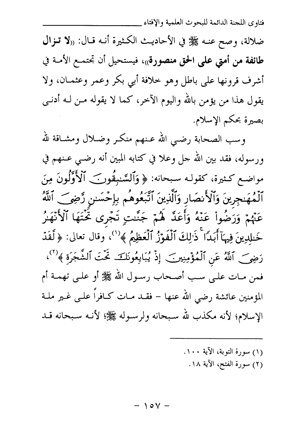 وسب الصحابة رضي الله عنهم منكر وضلال ومشاقة لله ورسوله، فقد بين الله جل وعلا في كتابه المبين أنه رضي عنهم في مواضع كثيرة، كقوله سبحانه: {وَالسَّابِقُونَ الْأَوَّلُونَ مِنَ الْمُهَاجِرِينَ وَالْأَنْصَارِ وَالَّذِينَ اتَّبَعُوهُمْ بِإِحْسَانٍ رَضِيَ اللَّهُ عَنْهُمْ وَرَضُوا عَنْهُ وَأَعَدَّ لَهُمْ جَنَّاتٍ تَجْرِي تَحْتَهَا الْأَنْهَارُ خَالِدِينَ فِيهَا أَبَدًا ذَلِكَ الْفَوْزُ الْعَظِيمُ} (¬2) ، وقال تعالى: {لَقَدْ رَضِيَ اللَّهُ عَنِ الْمُؤْمِنِينَ إِذْ يُبَايِعُونَكَ تَحْتَ الشَّجَرَةِ} (¬3) ، فمن مات على سب أصحاب رسول الله - صلى الله عليه وسلم - أو على تهمة أم المؤمنين عائشة رضي الله عنها- فقد مات كافرا على غير ملة الإسلام؛ لأنه مكذب لله سبحانه ولرسوله - صلى الله عليه وسلم -؛ لأنه سبحانه قد