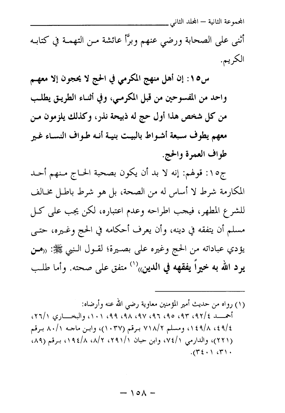 ج15: قولهم: إنه لا بد أن يكون بصحبة الحاج منهم أحد المكارمة شرط لا أساس له من الصحة، بل هو شرط باطل مخالف للشرع المطهر، فيجب اطراحه وعدم اعتباره، لكن يجب على كل مسلم أن يتفقه في دينه، وأن يعرف أحكامه في الحج وغيره، حتى يؤدي عباداته من الحج وغيره على بصيرة؛ لقول النبي - صلى الله عليه وسلم -: «من يرد الله به خيرا يفقهه في الدين (¬1) » متفق على صحته. وأما طلب