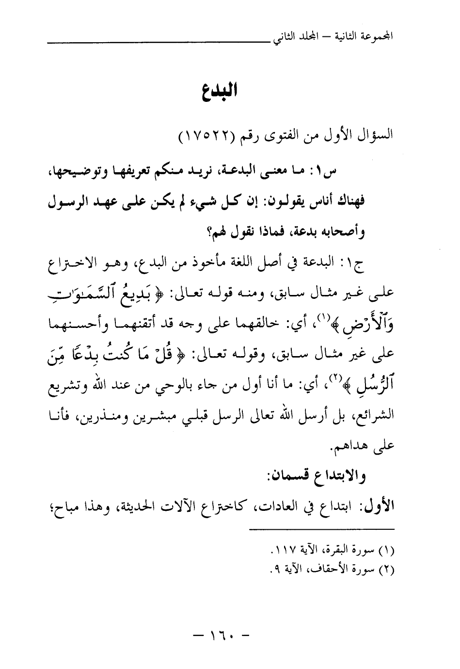 ج1: البدعة في أصل اللغة مأخوذ من البدع، وهو الاختراع على غير مثال سابق، ومنه قوله تعالى: {بَدِيعُ السَّمَاوَاتِ وَالْأَرْضِ} (¬1) ، أي: خالقهما على وجه قد أتقنهما وأحسنهما على غير مثال سابق، وقوله تعالى: {قُلْ مَا كُنْتُ بِدْعًا مِنَ الرُّسُلِ} (¬2) ، أي: ما أنا أول من جاء بالوحي من عند الله وتشريع الشرائع، بل أرسل الله تعالى الرسل قبلي مبشرين ومنذرين، فأنا على هداهم.