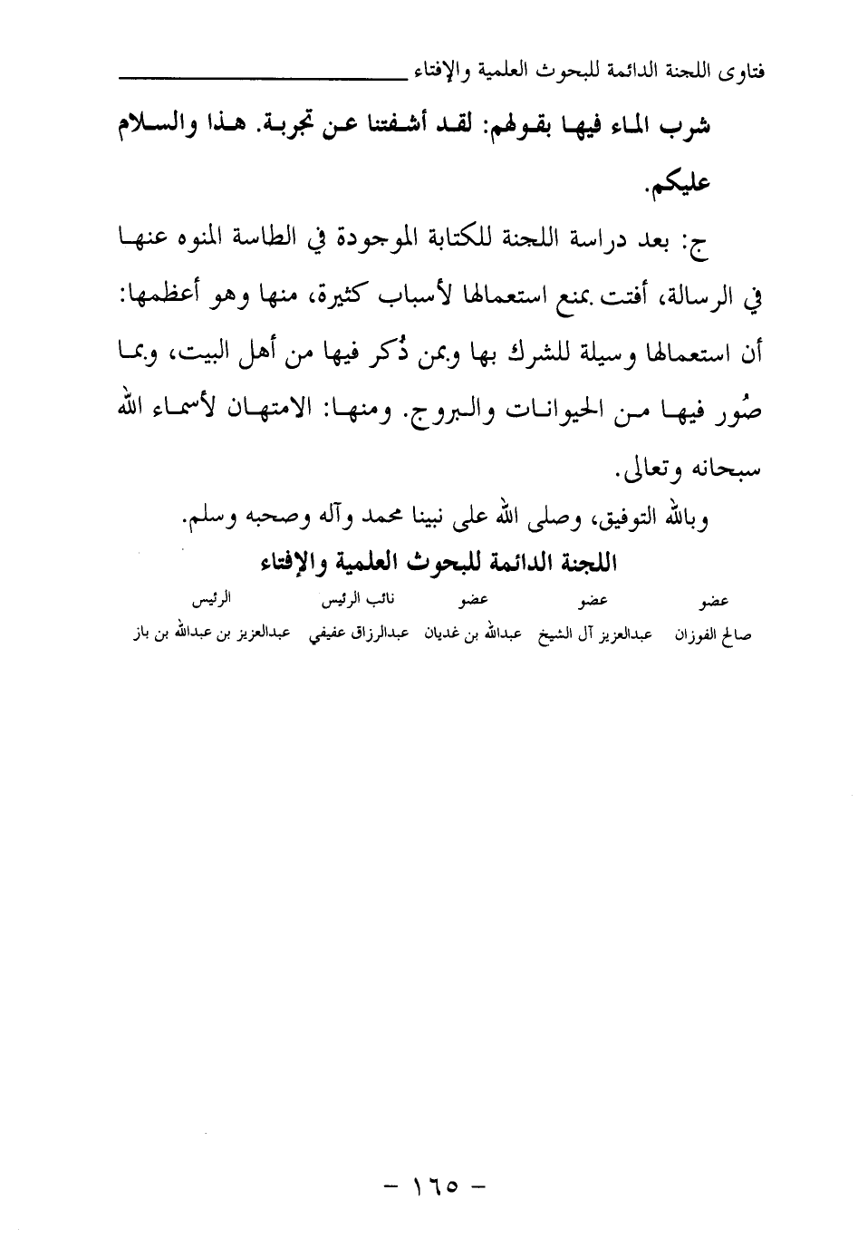 ج: بعد دراسة اللجنة للكتابة الموجودة في الطاسة المنوه عنها في الرسالة، أفتت بمنع استعمالها لأسباب كثيرة، منها وهو أعظمها: أن استعمالها وسيلة للشرك بها وبمن ذكر فيها من أهل البيت، وبما صور فيها من الحيوانات والبروج. ومنها: الامتهان لأسماء الله سبحانه وتعالى.