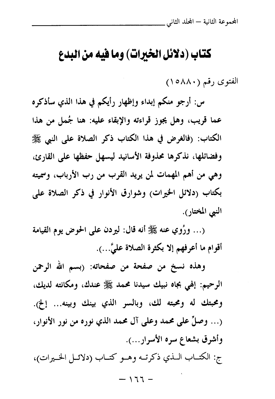 س: أرجو منكم إبداء وإظهار رأيكم في هذا الذي سأذكره عما قريب، وهل يجوز قراءته والإبقاء عليه: هنا جمل من هذا الكتاب: (فالغرض في هذا الكتاب ذكر الصلاة على النبي - صلى الله عليه وسلم - وفضائلها، نذكرها محذوفة الأسانيد ليسهل حفظها على القارئ، وهي من أهم المهمات لمن يريد القرب من رب الأرباب، وسميته بكتاب (دلائل الخيرات وشوارق الأنوار في ذكر الصلاة على النبي المختار) .