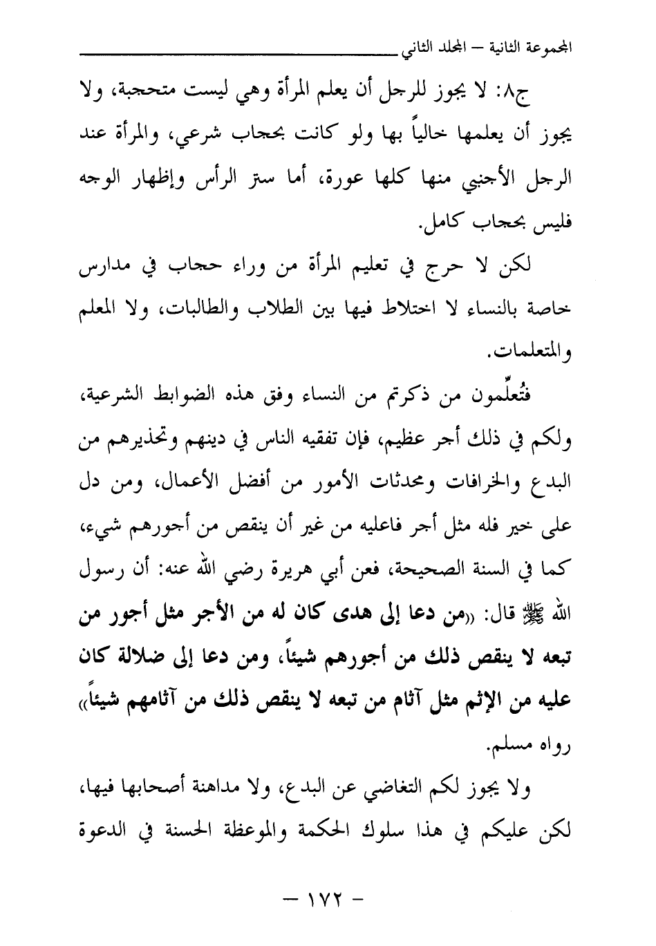 فتعلمون من ذكرتم من النساء وفق هذه الضوابط الشرعية، ولكم في ذلك أجر عظيم، فإن تفقيه الناس في دينهم وتحذيرهم من البدع والخرافات ومحدثات الأمور من أفضل الأعمال، ومن دل على خير فله مثل أجر فاعليه من غير أن ينقص من أجورهم شيء، كما في السنة الصحيحة، فعن أبي هريرة رضي الله عنه: أن رسول الله - صلى الله عليه وسلم - قال: «من دعا إلى هدى كان له من الأجر مثل أجور من تبعه لا ينقص ذلك من أجورهم شيئا، ومن دعا إلى ضلالة كان عليه من الإثم مثل آثام من تبعه لا ينقص ذلك من آثامهم شيئا (¬1) » رواه مسلم.