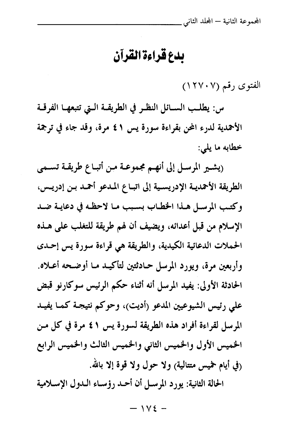 (يشير المرسل إلى أنهم مجموعة من أتباع طريقة تسمى الطريقة الأحمدية الإدريسية إلى اتباع المدعو أحمد بن إدريس، وكتب المرسل هذا الخطاب بسبب ما لاحظه في دعاية ضد الإسلام من قبل أعدائه، ويضيف أن لهم طريقة للتغلب على هذه الحملات الدعائية الكيدية، والطريقة هي قراءة سورة يس إحدى وأربعين مرة، ويورد المرسل حادثتين لتأكيد ما أوضحه أعلاه. الحادثة الأولى: يفيد المرسل أنه أثناء حكم الرئيس سوكارنو قبض على رئيس الشيوعيين المدعو (أديت) ، وحوكم نتيجة كما يفيد المرسل لقراءة أفراد هذه الطريقة لسورة يس41 مرة في كل من الخميس الأول والخميس الثاني والخميس الثالث والخميس الرابع (في أيام خميس متتالية) ولا حول ولا قوة إلا بالله.