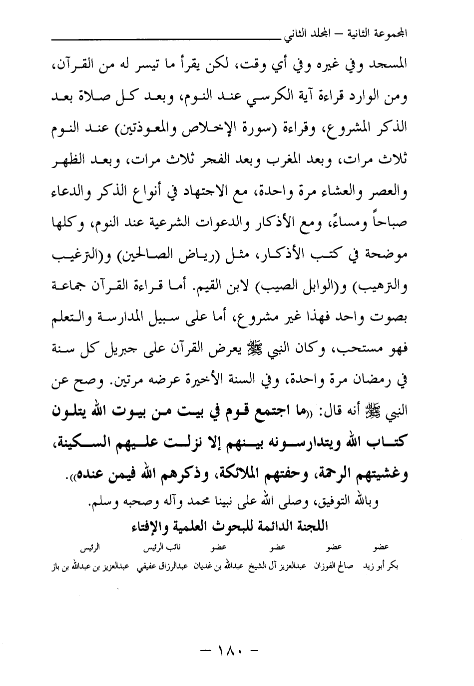 المسجد وفي غيره وفي أي وقت، لكن يقرأ ما تيسر له من القرآن، ومن الوارد قراءة آية الكرسي عند النوم، وبعد كل صلاة بعد الذكر المشروع، وقراءة (سورة الإخلاص والمعوذتين) عند النوم ثلاث مرات، وبعد المغرب وبعد الفجر ثلاث مرات، وبعد الظهر والعصر والعشاء مرة واحدة، مع الاجتهاد في أنواع الذكر والدعاء صباحا ومساء، ومع الأذكار والدعوات الشرعية عند النوم، وكلها موضحة في كتب الأذكار، مثل (رياض الصالحين) و (الترغيب والترهيب) و (الوابل الصيب) لابن القيم. أما قراءة القرآن جماعة بصوت واحد فهذا غير مشروع، أما على سبيل المدارسة والتعلم فهو مستحب، وكان النبي - صلى الله عليه وسلم - يعرض القرآن على جبريل كل سنة في رمضان مرة واحدة، وفي السنة الأخيرة عرضه مرتين. وصح عن النبي - صلى الله عليه وسلم - أنه قال: «ما اجتمع قوم في بيت من بيوت الله يتلون كتاب الله ويتدارسونه بينهم إلا نزلت عليهم السكينة، وغشيتهم الرحمة، وحفتهم الملائكة، وذكرهم الله فيمن عنده (¬1) » .