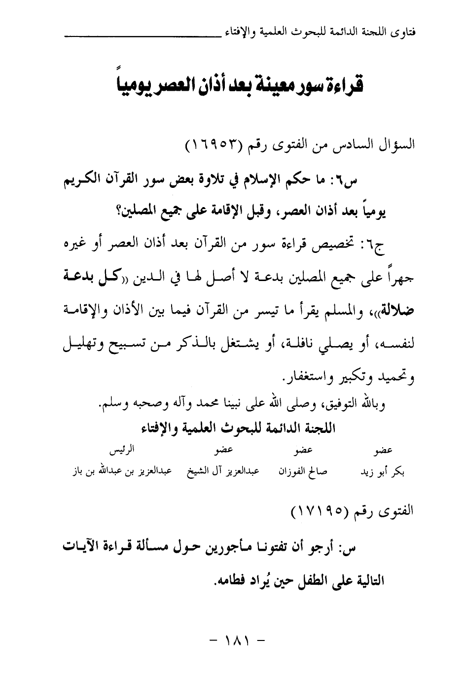 س6: ما حكم الإسلام في تلاوة بعض سور القرآن الكريم يوميا بعد أذان العصر، وقبل الإقامة على جميع المصلين؟