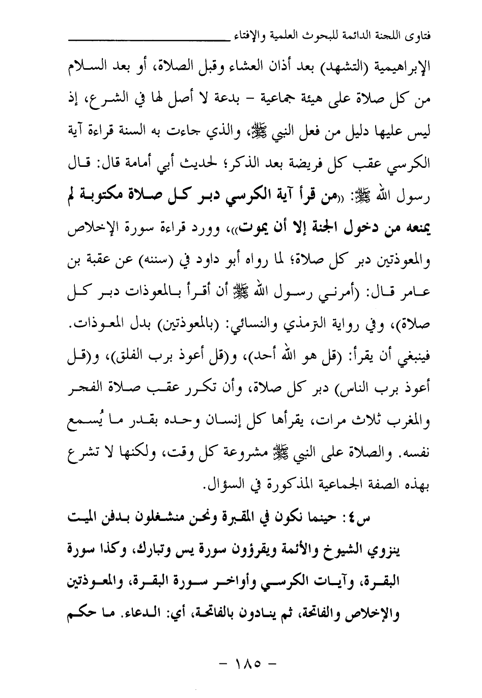 الإبراهيمية (التشهد) بعد أذان العشاء وقبل الصلاة، أو بعد السلام من كل صلاة على هيئة جماعية - بدعة لا أصل لها في الشرع، إذ ليس عليها دليل من فعل النبي صلى الله عليه وسلم، والذي جاءت به السنة قراءة آية الكرسي عقب كل فريضة بعد الذكر، لحديث أبي أمامة قال: قال رسول الله - صلى الله عليه وسلم -: «من قرأ آية الكرسي دبر كل صلاة مكتوبة لم يمنعه من دخول الجنة إلا أن يموت» ، وورد قراءة سورة الإخلاص والمعوذتين دبر كل صلاة، لما رواه أبو داود في (سننه) عن عقبة بن عامر قال: «أمرني رسول الله - صلى الله عليه وسلم - أن أقرأ بالمعوذات دبر كل صلاة (¬1) » ، وفي رواية الترمذي والنسائي: (بالمعوذتين) بدل المعوذات. فينبغي أن يقرأ: (قل هو الله أحد) ، و (قل أعوذ برب الفلق) ، و (قل أعوذ برب الناس) دبر كل صلاة، وأن تكرر عقب صلاة الفجر والمغرب ثلاث مرات، يقرأها كل إنسان وحده بقدر ما يسمع نفسه. والصلاة على النبي - صلى الله عليه وسلم - مشروعة كل وقت، ولكنها لا تشرع بهذه الصفة الجماعية المذكورة في السؤال.