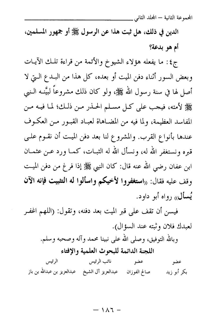 ج4: ما يفعله هؤلاء الشيوخ والأئمة من قراءة تلك الآيات وبعض السور أثناء دفن الميت أو بعده، كل هذا من البدع التي لا أصل لها في سنة رسول الله صلى الله عليه وسلم، ولو كان ذلك مشروعا لبينه النبي - صلى الله عليه وسلم - لأمته، فيجب على كل مسلم الحذر من ذلك؛ لما فيه من المفاسد العظيمة، ولما فيه من المضاهاة لعباد القبور من العكوف عندها بأنواع القرب. والمشروع لنا بعد دفن الميت أن نقوم على قبره ونستغفر الله له، ونسأل الله له الثبات، كما ورد عن عثمان بن عفان رضي الله عنه قال: «كان النبي - صلى الله عليه وسلم - إذا فرغ من دفن الميت وقف عليه فقال: (استغفروا لأخيكم واسألوا له التثبيت فإنه الآن يسأل) (¬1) » رواه أبو داود.