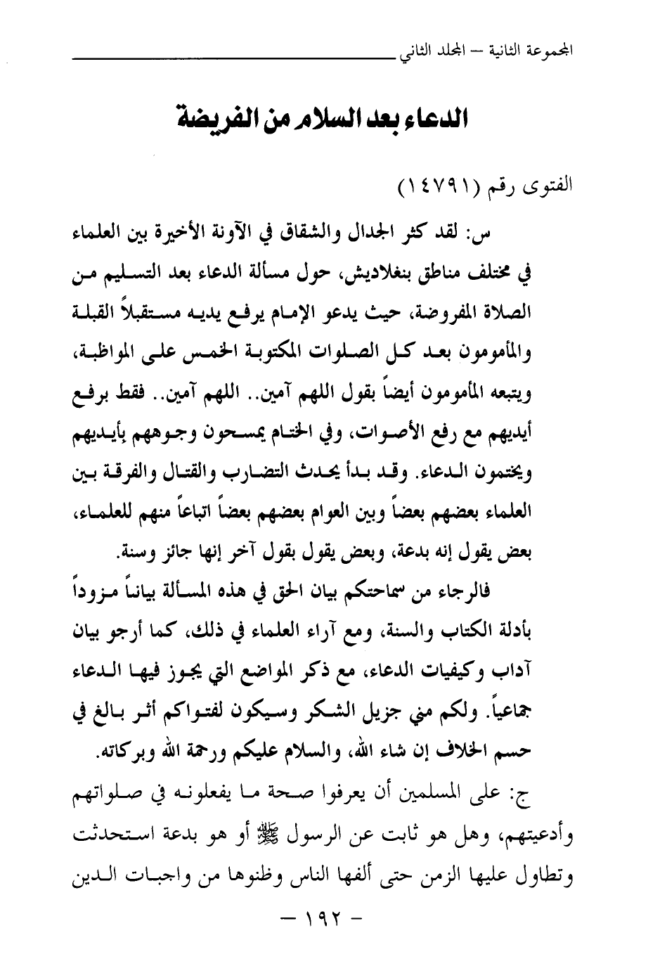 س: لقد كثر الجدال والشقاق في الآونة الأخيرة بين العلماء في مختلف مناطق بنغلاديش، حول مسألة الدعاء بعد التسليم من الصلاة المفروضة، حيث يدعو الإمام يرفع يديه مستقبلا القبلة والمأمومون بعد كل الصلوات المكتوبة الخمس على المواظبة، ويتبعه المأمومون أيضا بقول اللهم آمين. . اللهم آمين. . فقط برفع أيديهم مع رفع الأصوات، وفي الختام يمسحون وجوههم بأيديهم ويختمون الدعاء. وقد بدأ يحدث التضارب والقتال والفرقة بين العلماء بعضهم بعضا وبين العوام بعضهم بعضا اتباعا منهم للعلماء، بعض يقول إنه بدعة، وبعض يقول بقول آخر إنها جائز وسنة.