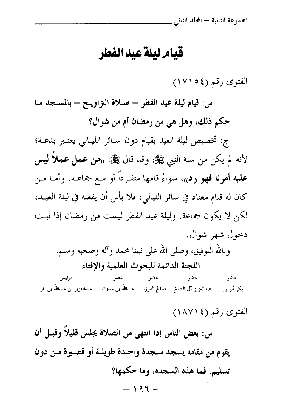 ج: تخصيص ليلة العيد بقيام دون سائر الليالي يعتبر بدعة؛ لأنه لم يكن من سنة النبي - صلى الله عليه وسلم - وقد قال - صلى الله عليه وسلم -: «من عمل عملا ليس عليه أمرنا فهو رد (¬1) » ، سواء قامها منفردا أو مع جماعة، وأما من كان له قيام معتاد في سائر الليالي، فلا بأس أن يفعله في ليلة العيد، لكن لا يكون جماعة. وليلة عيد الفطر ليست من رمضان إذا ثبت دخول شهر شوال.