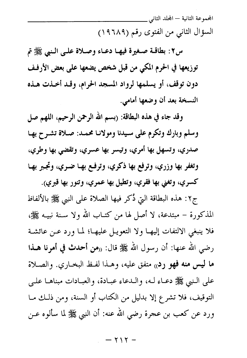 ج2: هذه البطاقة التي ذكر فيها الصلاة على النبي - صلى الله عليه وسلم - بالألفاظ المذكورة - مبتدعة، لا أصل لها من كتاب الله ولا سنة نبيه - صلى الله عليه وسلم -، فلا ينبغي الالتفات إليها ولا التعويل عليها، لما ورد عن عائشة رضي الله عنها: أن رسول الله - صلى الله عليه وسلم - قال: «من أحدث في أمرنا هذا ما ليس منه فهو رد (¬1) » متفق عليه، وهذا لفظ البخاري. والصلاة على النبي - صلى الله عليه وسلم - دعاء له، والدعاء عبادة، والعبادات مبناها على التوقيف، فلا تشرع إلا بدليل من الكتاب أو السنة، ومن ذلك ما ورد عن كعب بن عجرة رضي الله عنه: أن «النبي - صلى الله عليه وسلم - لما سألوه عن